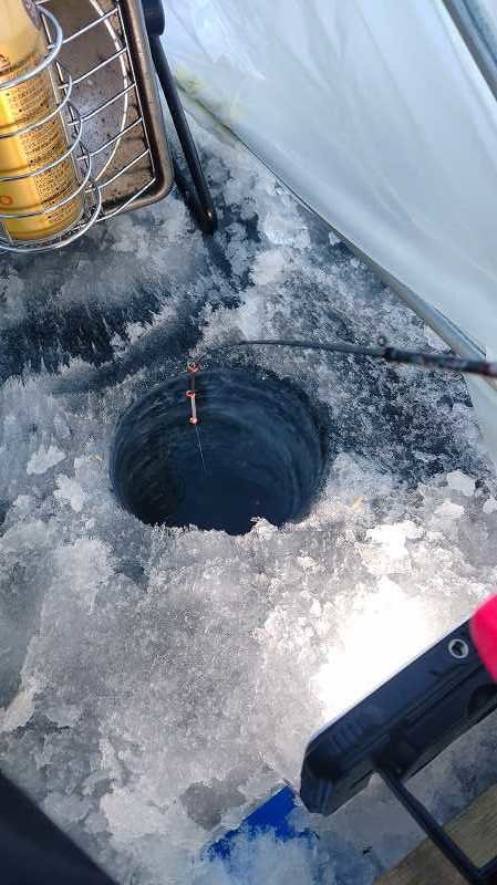 亀田が入ったポイントには平日だったこともあり誰もおらずポツンと一人でやっていたのですが、仕掛を落とすとすぐに群れが入ってくる、仕掛を上げると群れが居なくなる、再び仕掛けを入れるとまた入ってくるの繰り返しでした。しかもミニミニマッチ棒サイズは皆無で全匹8㎝オーバーでした、氷上解禁当初もそうでしたがこの場所は大きいのがむれてるようです。