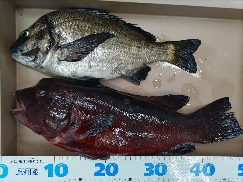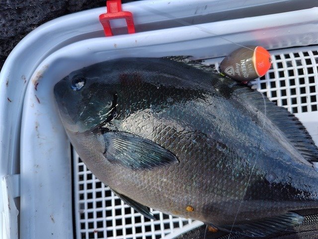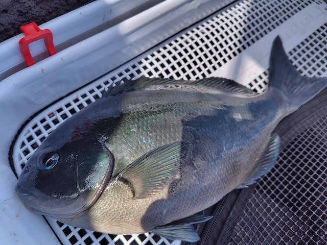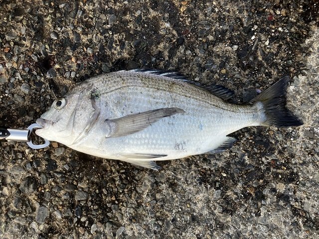 おっ!ウキが入った!ギュンギュン!軽いけどグレっぽいやん!ひょいと抜き上げたのは30cmくらいの尾長グレ!何だかうれしい!キープしとこ・・すでに13時・・そして納竿10分前にもう1枚、同型のグレが釣れてくれました。竿3本沖の6ヒロ・・厳しい展開でした。