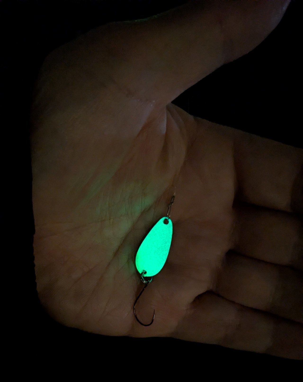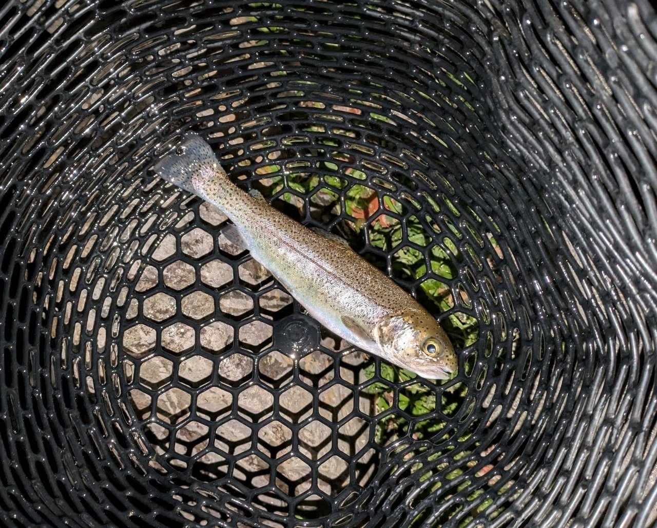 まずはルアーを中央付近まで投げてゆっくり巻いて誘って行くと、すぐに反応がありニジマスがヒット!嬉しい1匹目です。続けて同行したスタッフも同じパターンで1匹目をゲットです。