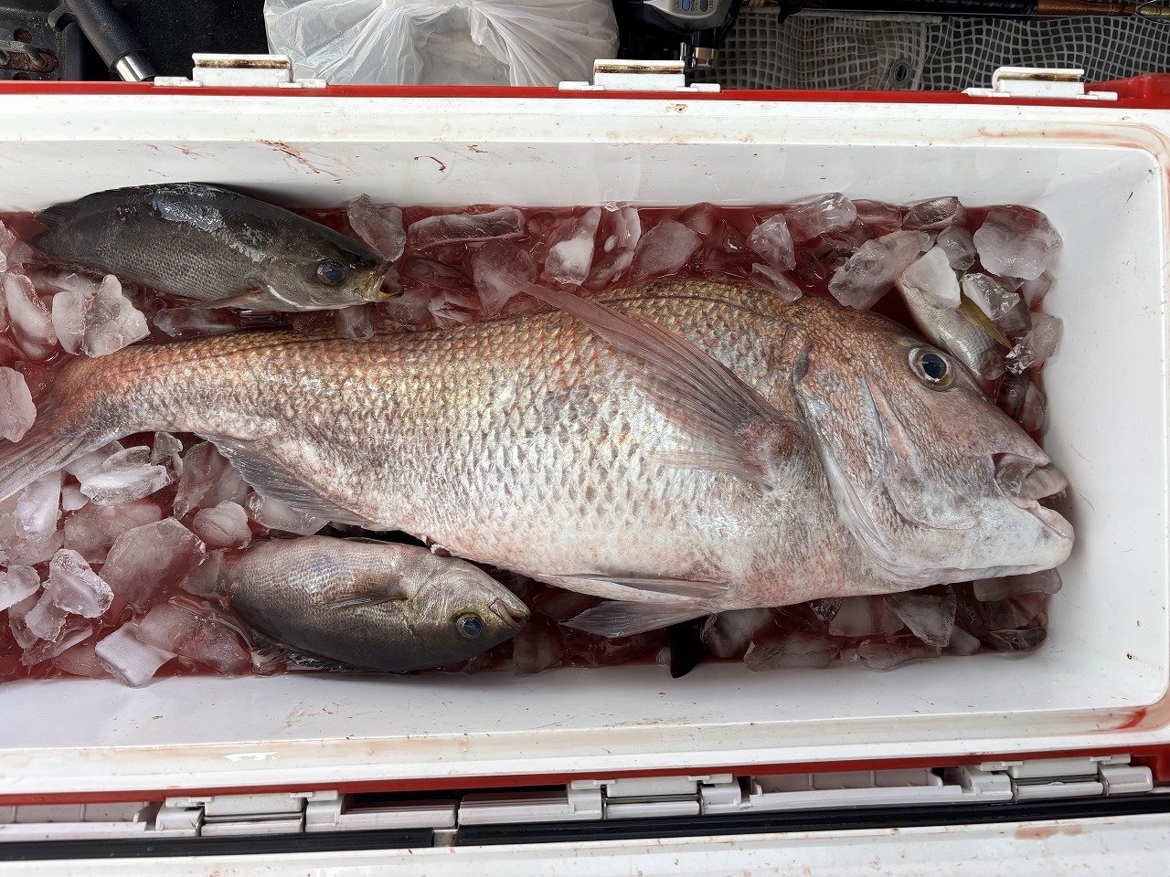 当店常連のマダイフリークE様より釣果報告いただきました。本日、御前崎港増福丸さんにて出船されたE様…釣行前日店頭にてエサを購入いただいた際には、『顔が見れればOK!』と言っていたE様ですが、本日70㎝6.0㎏のBIGマダイを筆頭に5枚のマダイを釣り上げ、みごと竿頭。久し振りの大ダイにご本人様もビックリ…。マダイ他イサキもしっかりゲットして本日の釣りを終えられたそうです。いよいよのっこみシーズン突入!?BIG真鯛を仕留める絶好の機会です。ぜひ、皆様もお出掛け下さい。なお、御前崎港の船宿さんが燃料不足が原因で制限出船となるようです。詳細は、予約の際に各船長にご確認下さい。E様、おめでとうございます。お疲れのところありがとうございました。