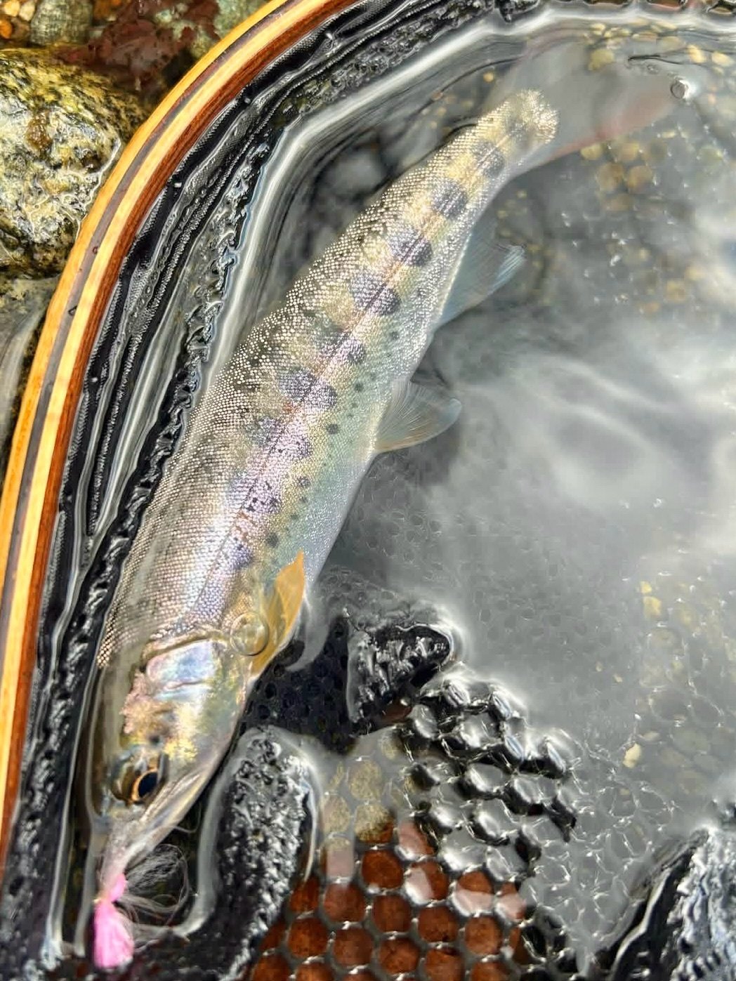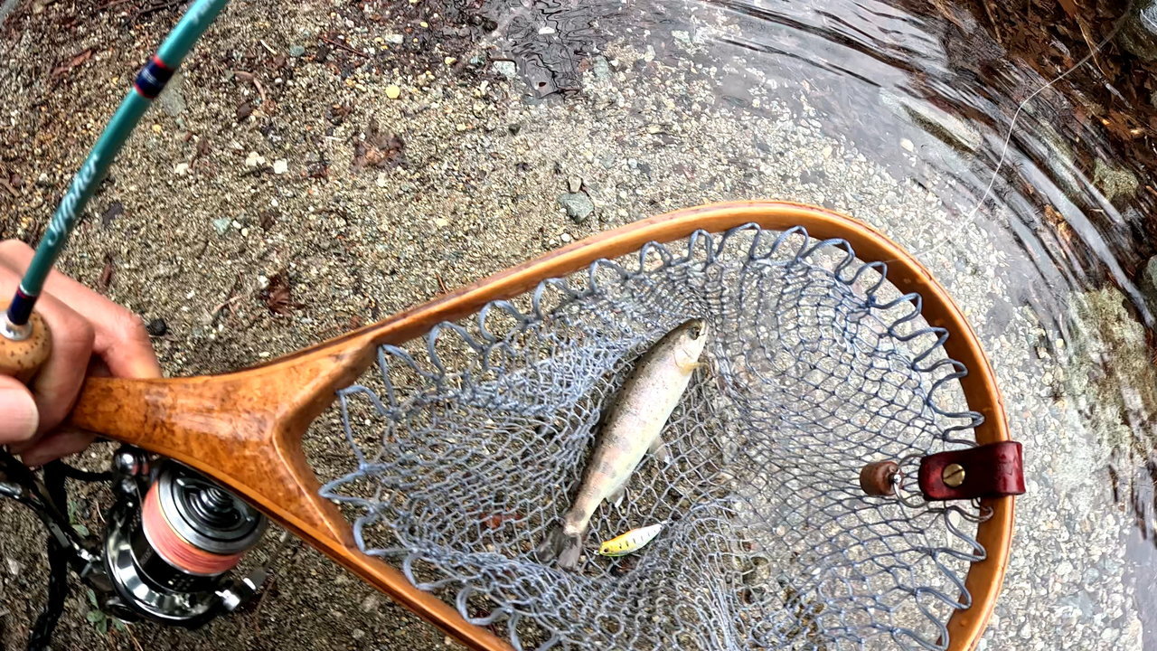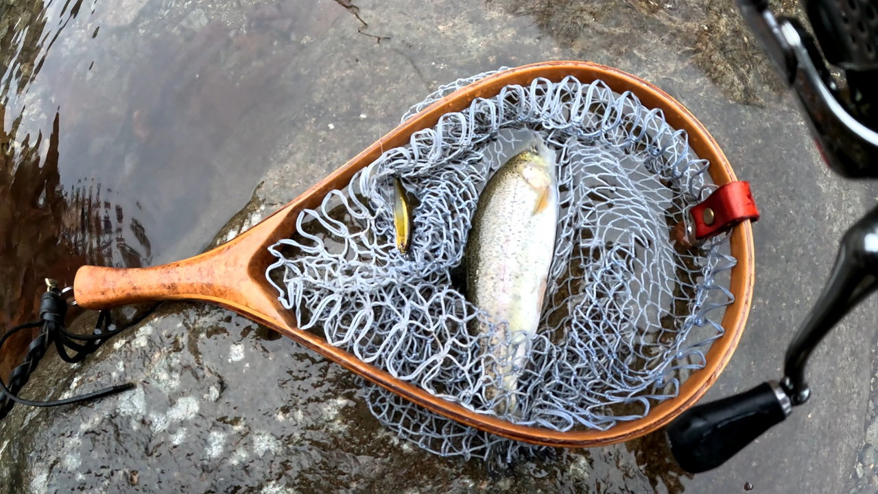 朝の一匹目は22cmほどのニジマス。その後2匹のヤマメを2時間半ほどでキャッチ。
