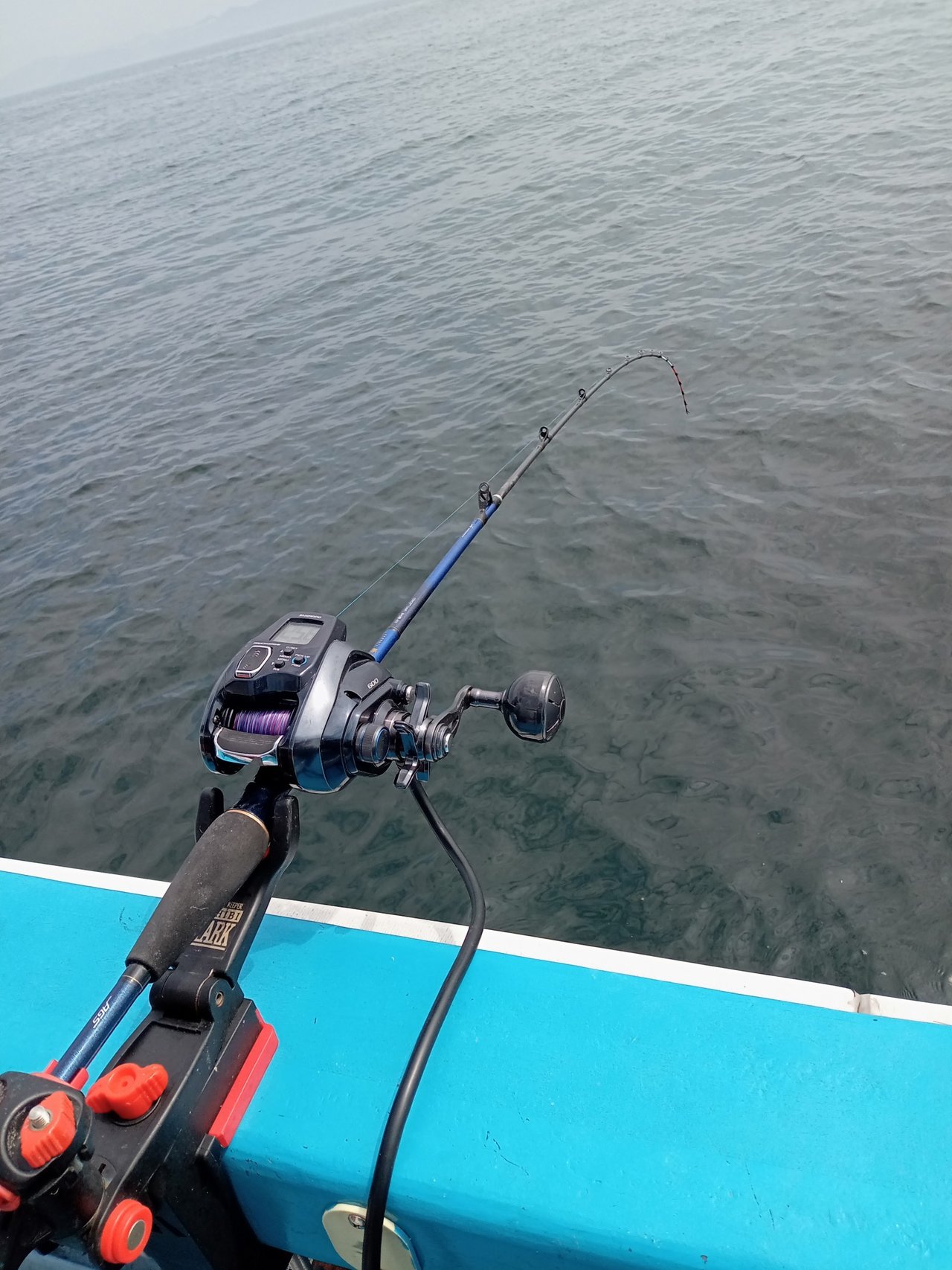 ■ロッド:テンヤタチウオ竿 ■リール:小型電動 ■ライン:PE1.5 ■ルアー:オモリ40号