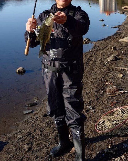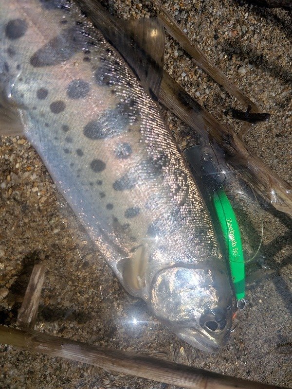 まだまだ活発にルアーを追う水温ではない為、クロス~ダウンクロスがメインの釣り方となります。水流の強さにスプーンを合わせてじっくり見せるパターンが好調。堰堤下のポイントでは、ミノーの移動距離を抑えたタテのトゥイッチが効きました。