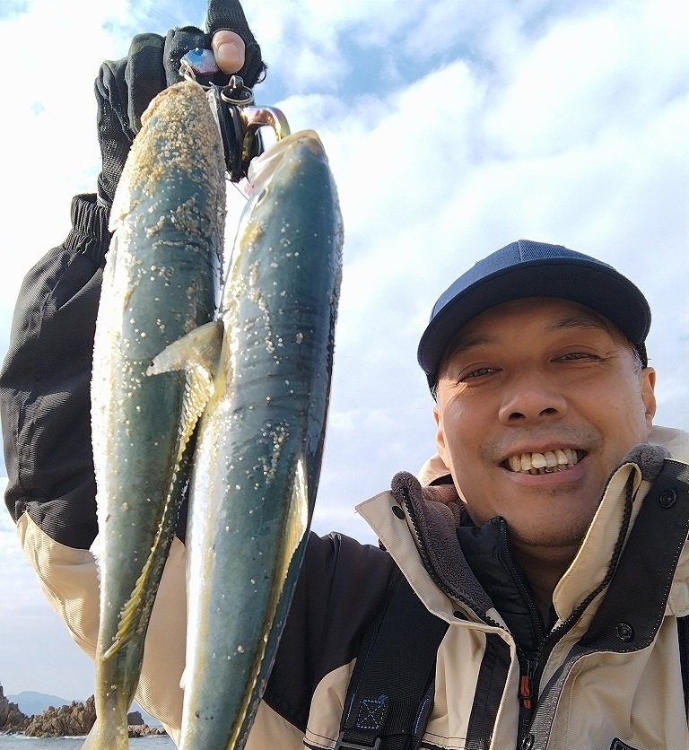 バスディオーディン95Sやメタルジグ(上州屋PBコーストジグ)をキャストしていると、流れ込みの辺りでヒット。が、フックアウト。その後、数投後に再びヒット!上がってきたのはツバス、それもダブルヒット!!トィッチを入れながら早巻きでのヒットでした。その後、もう1匹追加しましたが、その後アタリが無くなり終了。