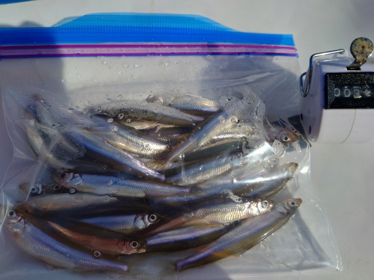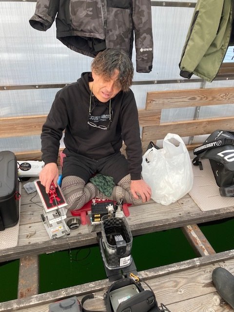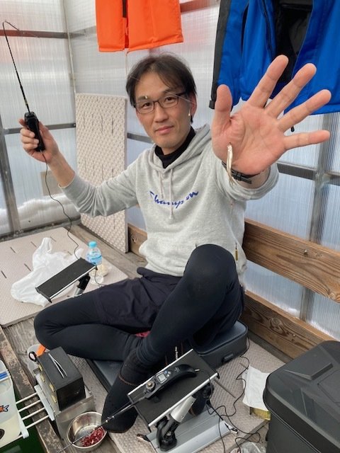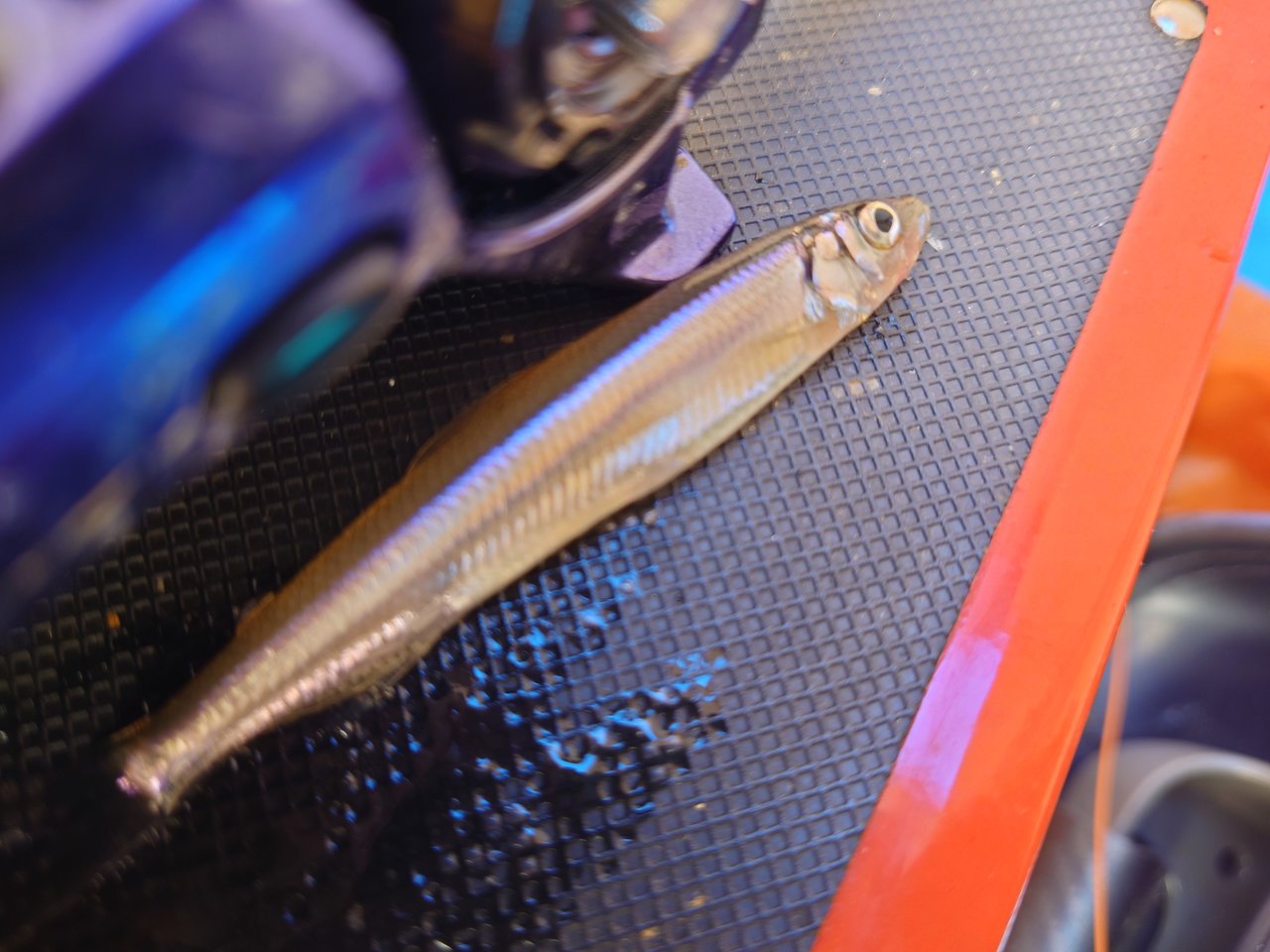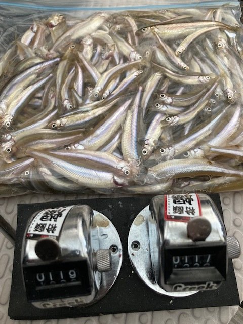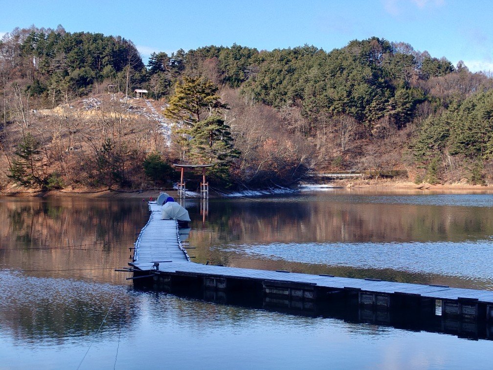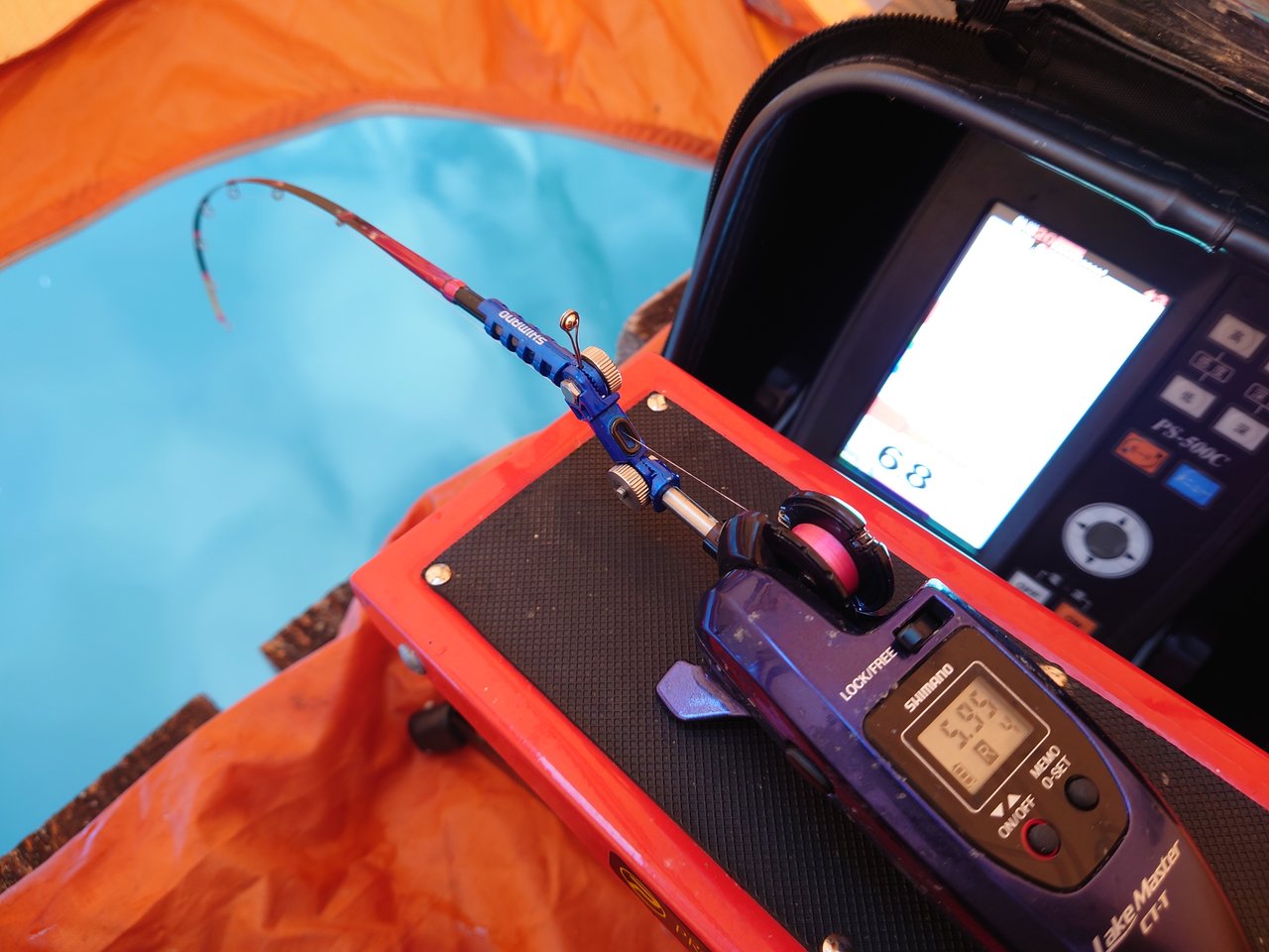 解禁から1週間が経過した美鈴湖へワカサギ釣りに行ってきました。サイズが大きくて朝から2本出してスタートした仕掛けが、お互いに絡まって時間をロスした前回の反省を踏まえて、仕掛けは全長77㎝から64㎝と短く、オモリも3.5gから8gに変更をしてトラブルが起きづらいように修正。魚探で反応を見てみると解禁日のような中層に群れはいないが、底付近には定期的に入っている感じ。トラブル防止の為に多点掛けは狙わず1匹ずつ確実に取り込みを行い8時までには30匹に到達。しかしそこからが試練でした。まったく群れが入ってこなくなり、魚探に反応していないワカサギを呼び込もうと誘いを繰り返すも状況は変わらず・・3時までやるつもりが11時前には心が折れて終了。氷が張りだせばまた群れが回遊しやすくなると思うので、それまでは回遊が見込める朝の時間帯にトラブルなく数を稼げるかが需要です。