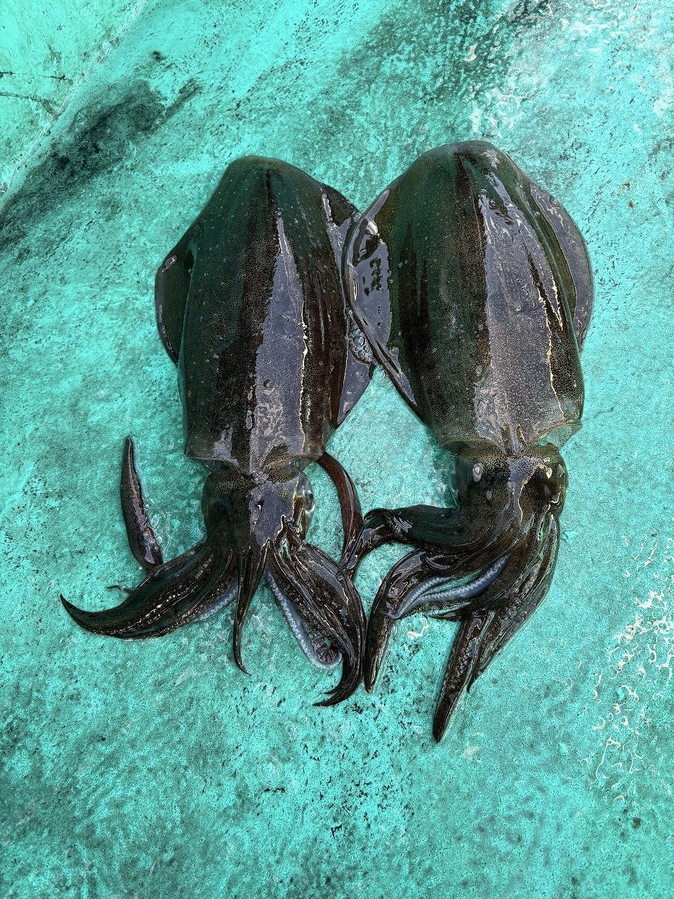 その後も水深30m台のポイントを流しますが、更に潮の流れが緩く、風も微風になった為、エギをキャストしてからの『聞き誘い』で追加となる約500gをキャッチする事ができました。