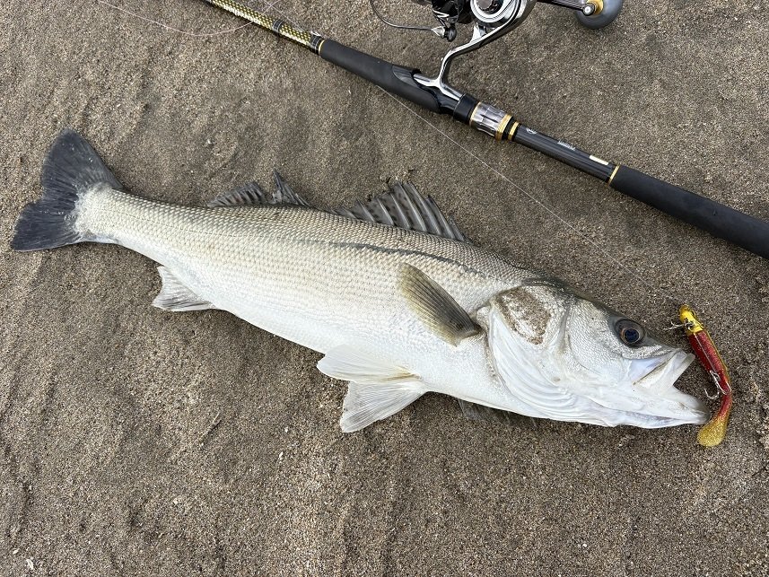 日が高くなりボウズを覚悟した頃、釣り人もまばらになったところで「竿抜けポイントでもないかなぁ~」なんて思いながら『浜王』でランガンしていたら、なんとかシーバスを釣ることができました(^-^;