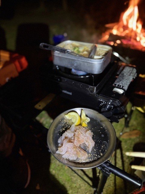寒い冬だからこそ楽しめる、おこもりキャンプ。釣ったカサゴも早速食べてしまいました。