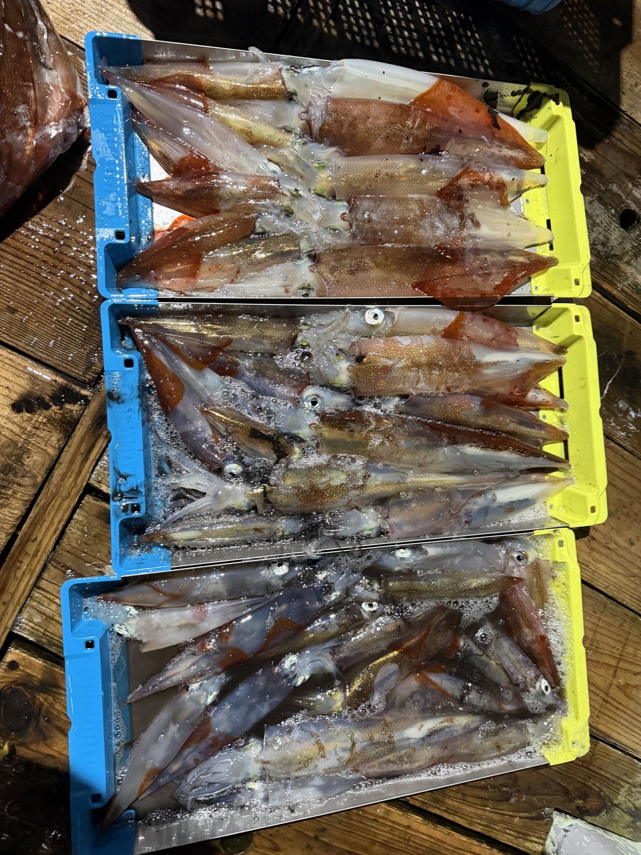 年末ですが、前回の釣行での気づきの検証をしたくて、キャンセル待ちで空きが出たので釜石唐丹健勝丸にてヤリイカへ行って来ました。3時半出船、前回と同じ60mのポイントに投錨しスタートします。荒れ後ここ数日全くダメで違う方のイカも居なくなったとの事だったのでのんびりスタートします。しばらくすると別のイカの群れが通過しみなさんの竿が曲がります、それからまた少ししてヤリイカが釣れ始まります、ヤリイカが帰って来たようです。別のイカはたまに入って来ますが、ヤリイカメインで釣りになります、小さいのからでっかいのまで居ます、掛けれない小さなヤリイカのアタリに悶絶し、微妙なアタリに合わせるとロッドに重みがドスンと乗っかるデカヤリに驚き、アタリの遠い時間はありましたが、前日までの状況を見ればいい日に当たりました。これからますますヤリイカ大きくなるはずです、別のイカもおとなしくなりこれからが三陸ヤリイカのベストシーズンです!