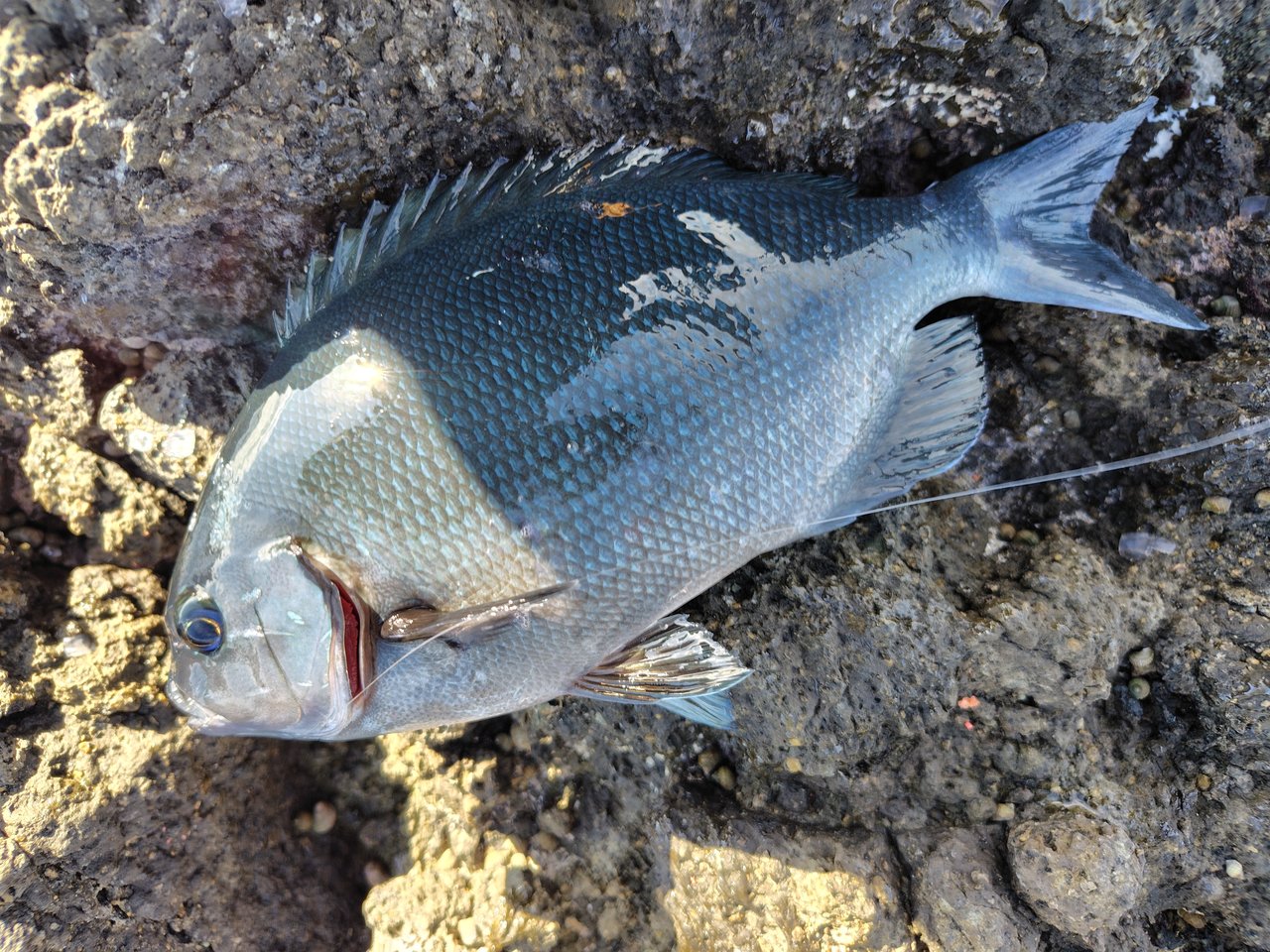 南伊豆・石廊崎の沖磯へ行ってきました。渡船はいつもお世話になっている宮島丸さんです。天候は晴れ。風が北東から西に変わってくる予報でした。船の水温計で17.5℃。無事に渡礁し朝日に安全祈願と釣果祈願してからウキフカセ釣りを開始。潮は朝の内はゆっくりとした上り潮で徐々に沖側から押し付ける潮に・・。釣りを始めてしばらくすると突然ラインが張るアタリ。気持ち良く竿を曲げてくれたのはイサキ!!引きも強くて楽しい~。連発こそしなかったものその後もポツリポツリと釣れ楽しめました。足元ではブダイ。期待のメジナはなかなか釣れず苦戦したのですが、唯一釣れたメジナが良型の尾長メジナでラッキーでした♪いい釣り納めになりました。