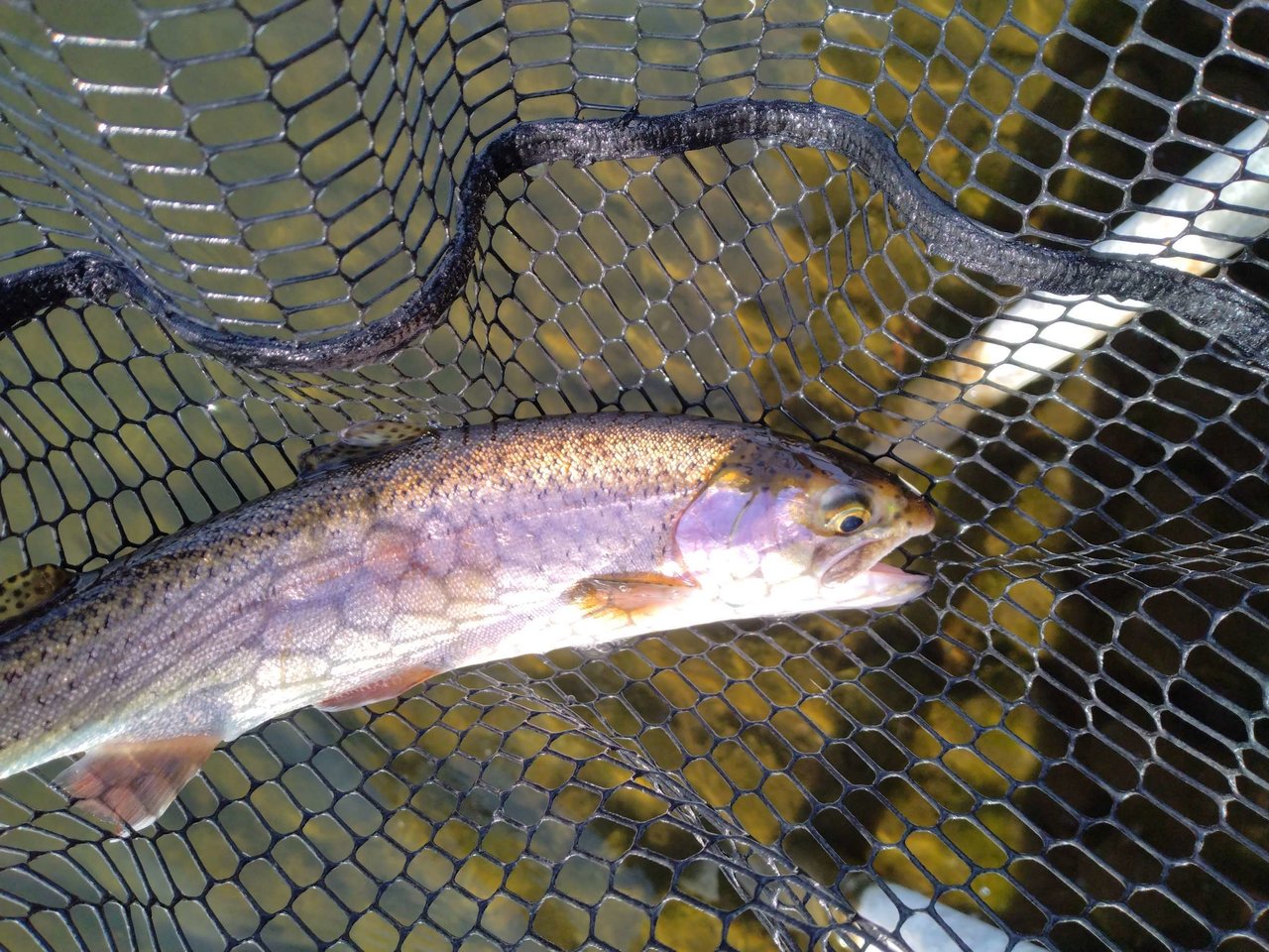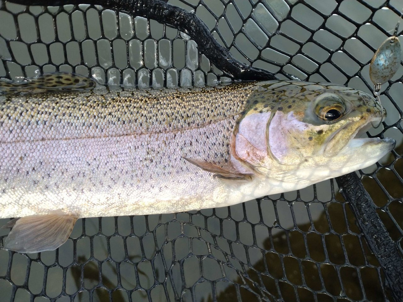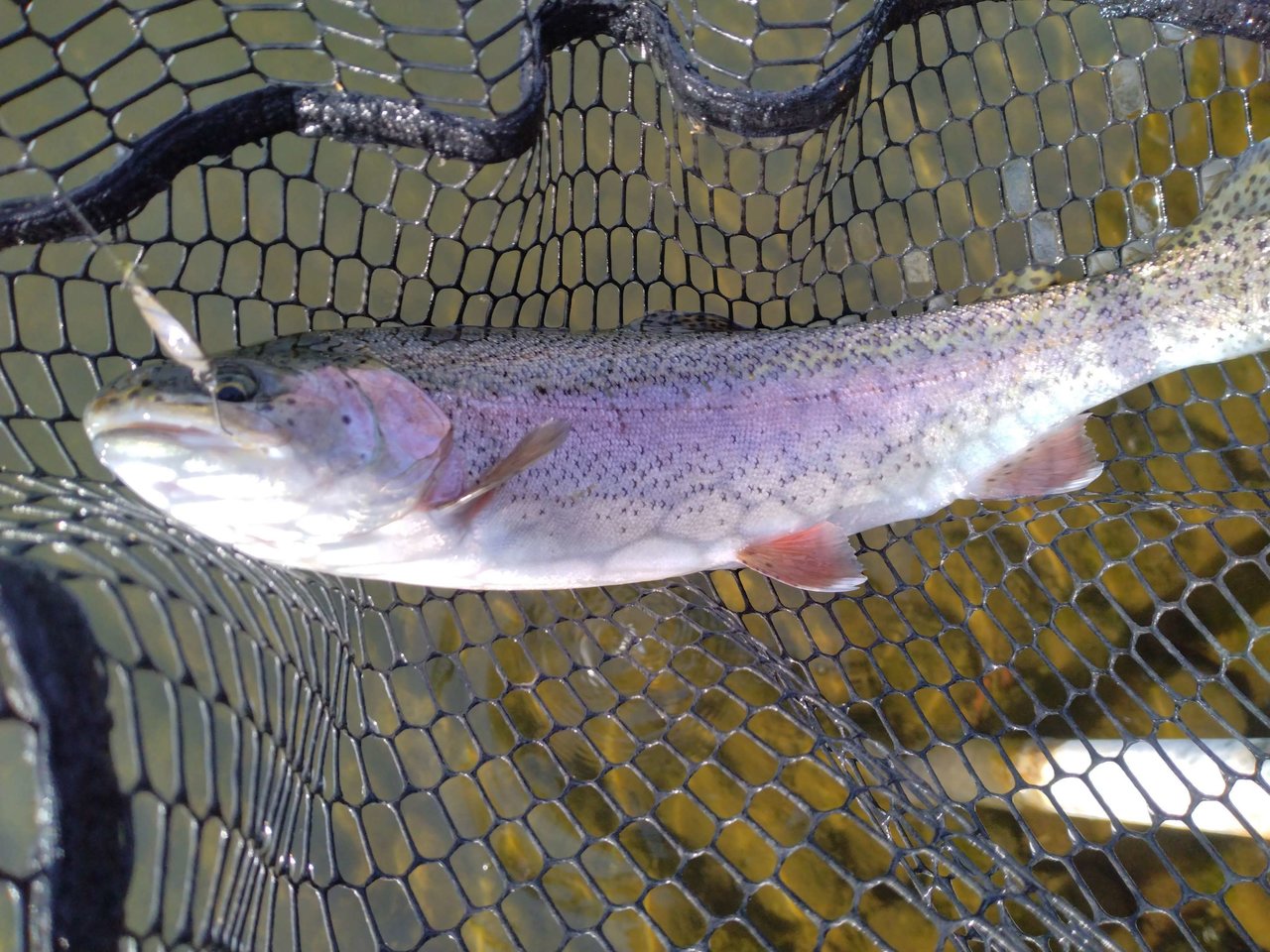 朝7時過ぎに到着。午前の半日勝負。到着時の気温は-2℃・・・寒いです!!最初はガイドも凍ってしまい大変でした。鹿留湖は貸し切り状態でしたが、日の当たる場所で粘ります。同行者の石附君は開始早々に雪の残っているエリアでポゴでヒット!!幸先が良いですが、後で状況を聞くと最初の1匹以降釣れていないとの事。自分はスプーンで探りますが反応が得られないのでクランクに変更後すぐにヒット。ボトムちょい上のレンジをゆっくり引いて来るパターンでした。立て続けにヒットさせる事に成功したのでルアー変更。同じようなルアーでもシルエットの違いなのか、反応無し。最初のクランクがやっぱり釣れます。掃き出しの方で釣っている石附君と合流してヒットルアーを教えると直ぐにヒット!!やっぱり今日はこのクランクがハマっていました。その後渓流ゾーンへ行ってみましたが、魚影が微妙なので鹿留湖へ戻ってきて時間まで思う存分釣りました!!