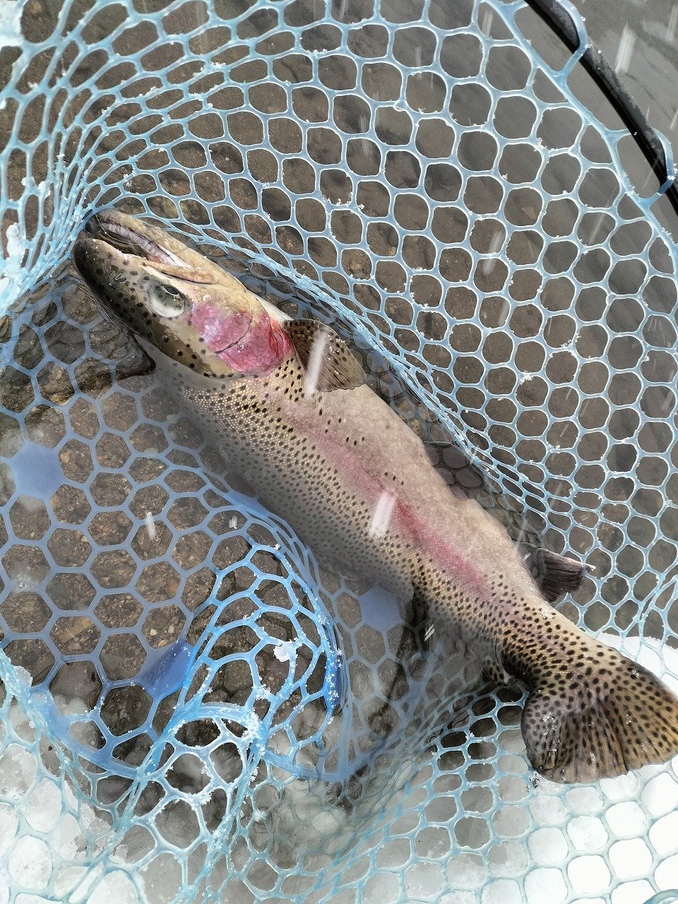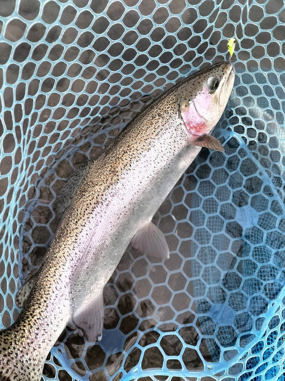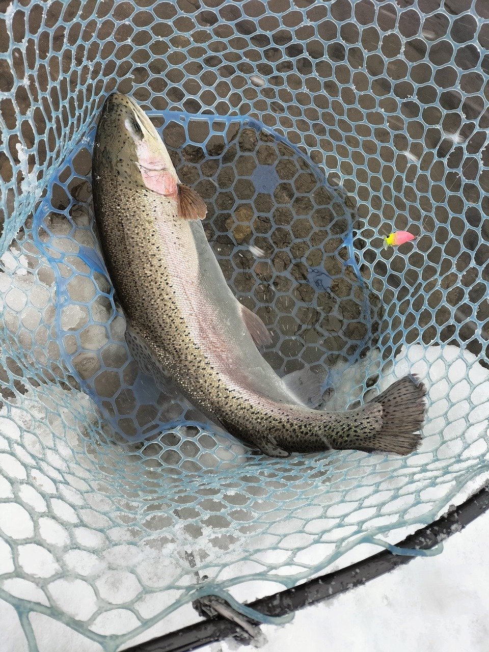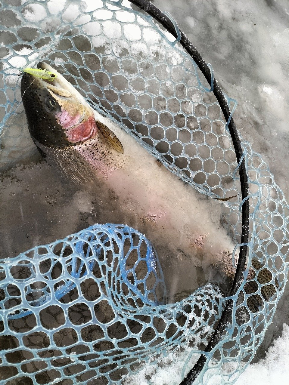 午後から五頭FPへ行ってきました。スタートは午後1時。活性の高いレギュラーサイズがいてくれたおかげで、開始から3時頃まではシャローレンジでルアーチェンジをしながらポツポツ追加といった状況。3時以降はレンジを下げたり、ボトムを探ったり色々試してみましたが一気にペースダウン…。4時過ぎには、手の感覚もなくなり、ガイドも凍りつき出したので、早めに退散しました。前半で20尾キャッチも30尾に届きませんでした…。