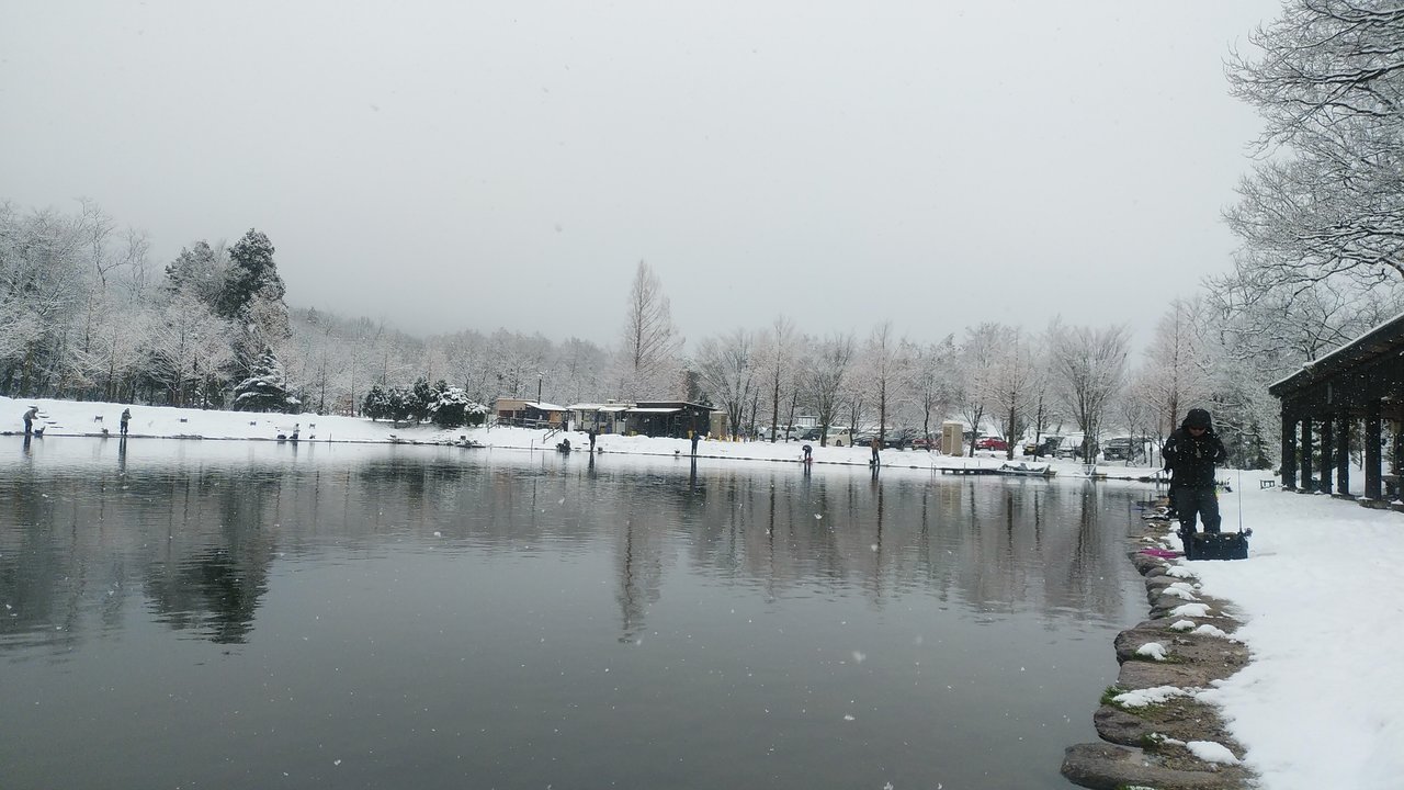 スタッフ高橋で~す!エリアトラウト釣行!いなべのサンクチュアリさんへ。雪が積もっています・・関が原は大雪警報が出てましたが、いなべ市は少し積もっているくらい。完全防寒対策!しっかり着込んで釣り開始!しかし足元の防寒をしくじった・・雪の中で普通の長靴は冷たすぎる・・防寒ブーツ、必須ですよ!とりあえずは我慢しましょう。