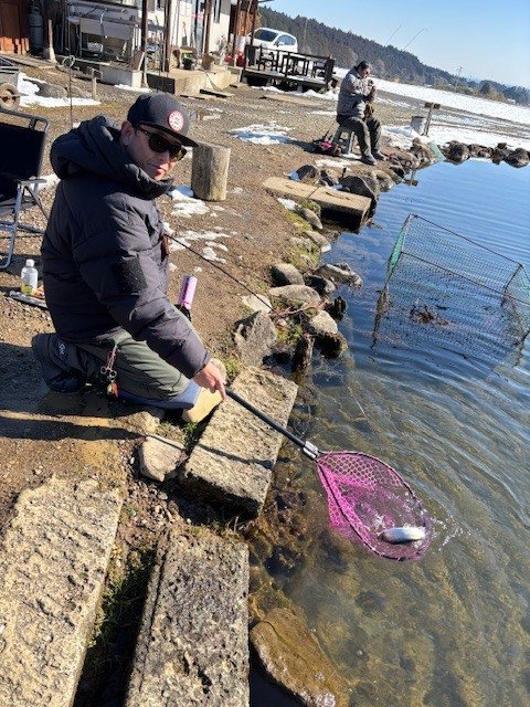 また午後からフラリと五頭FPへ行ってきました。開始は午後1時ちょい前。空いていた隅っこで楽しんできました。活性の高いレギュラーサイズがいてくれたおかげで、開始早々は連発!しかし、だんだん渋くなりカラーチェンジやレンジを下げたりでポツポツといった状況に…。早掛けチャレンジも辛うじてハンバーガーをゲットできました♪鬼門の3時以降もボトムやリアクションなどでポツポツといった状況でした。甘噛みのレギュラーサイズばかりでバラシ多数でしたが雪の降りしきる中、終了間際まで楽しめました!