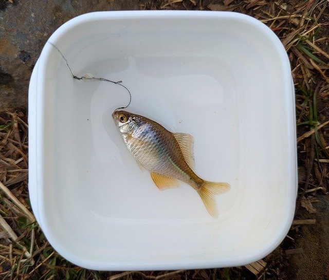 竿先と同じ長さに仕掛けを投入!これを繰り返していると徐々にクチボソが集まって来た。ウキが消し込み合わせてみるとクチボソがヒット!やはり小振りなサイズだ。更に魚が集まり出し、アタリが頻繁に出てきた。そしてもう一つの人気ターゲット!タナゴも奇跡的にゲット!貴重な一尾で、うれしいの一言。1時間程度で20匹行かない位でしたが、この時期を考えればこれだけ釣れれば充分でした。3㎝にも満たないサイズから5,6㎝位までのサイズが釣れました。