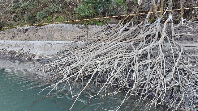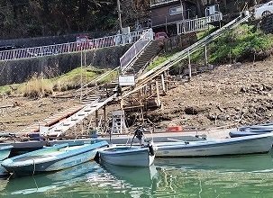 多少減水しているのかなぁ~と思いつつ桟橋に着くと、荷物を運ぶリフトの終点の下にさらに階段ができ、異様なくらいの減水にびっくり!