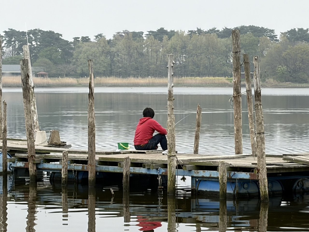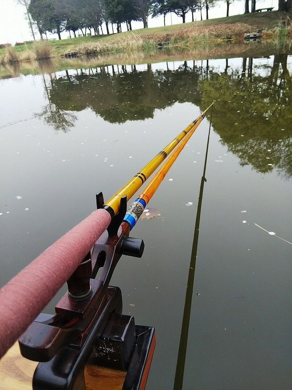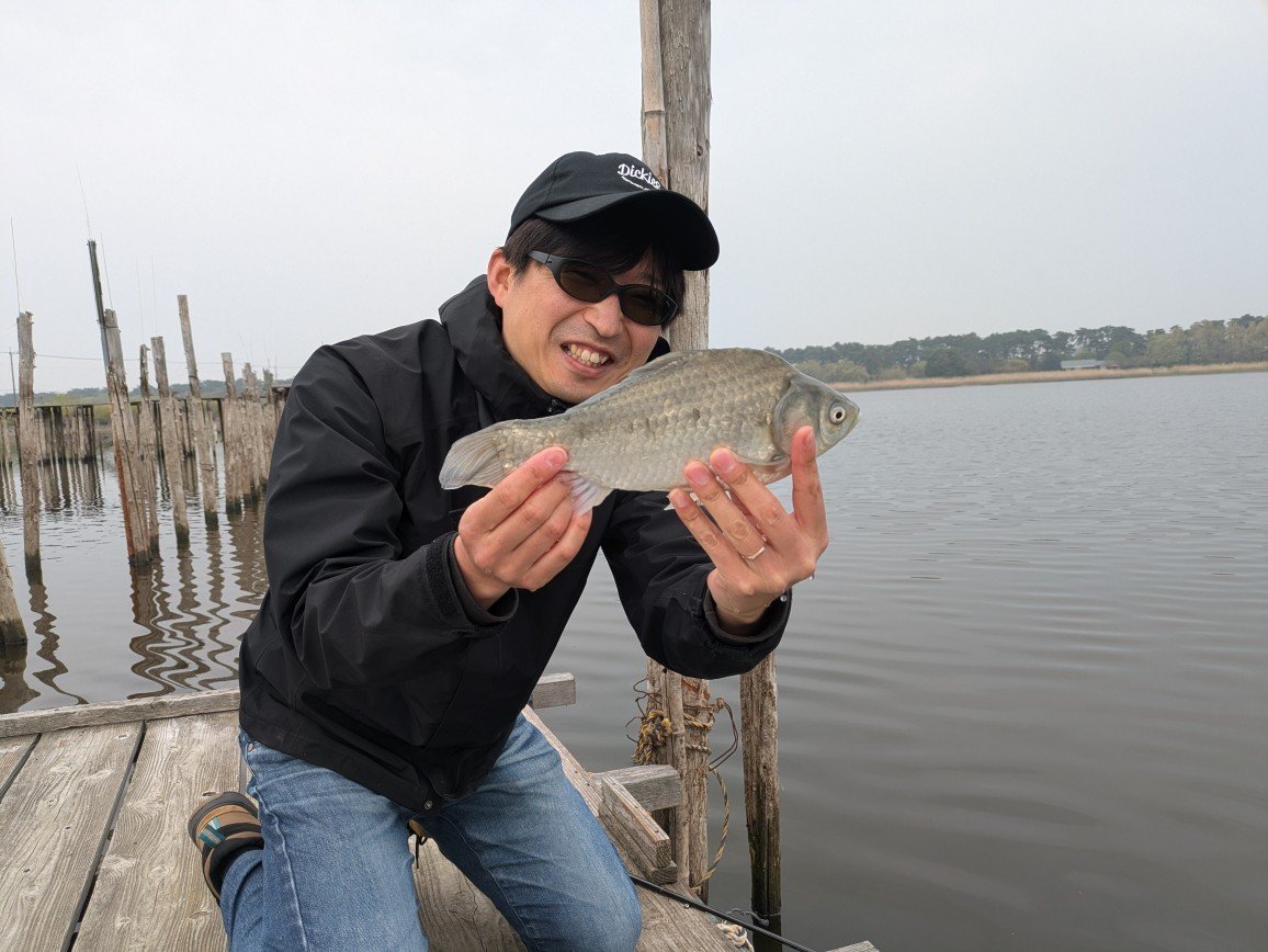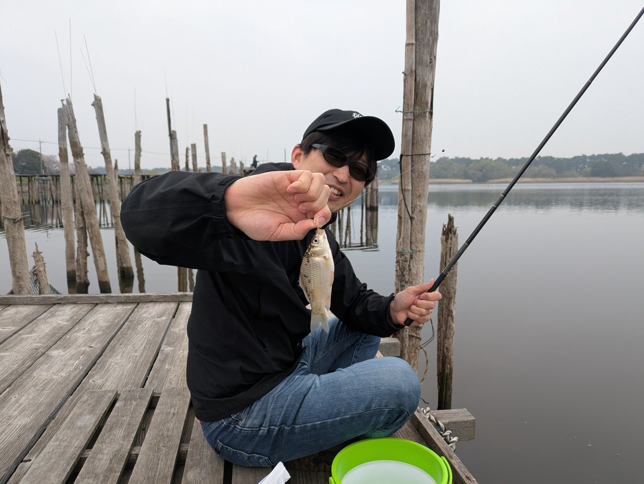 午前9時5分に到着し入漁券を購入してから釣り開始!塚原は3.6mののべ竿に玉ウキ仕掛けでエサはミミズ。安藤は2.7mののべ竿に玉うき仕掛けでエサはグルテン。開始1時間は陸からやるもこの日は反応がなく…。ちょうど桟橋が空いたので移動すると、徐々に魚の活性があがってきたようでいたるところで跳ねが見られるように。徐々にウキに反応がみられるようになり、コンスタントにアタリも出て飽きない程度にフナを釣ることができました!