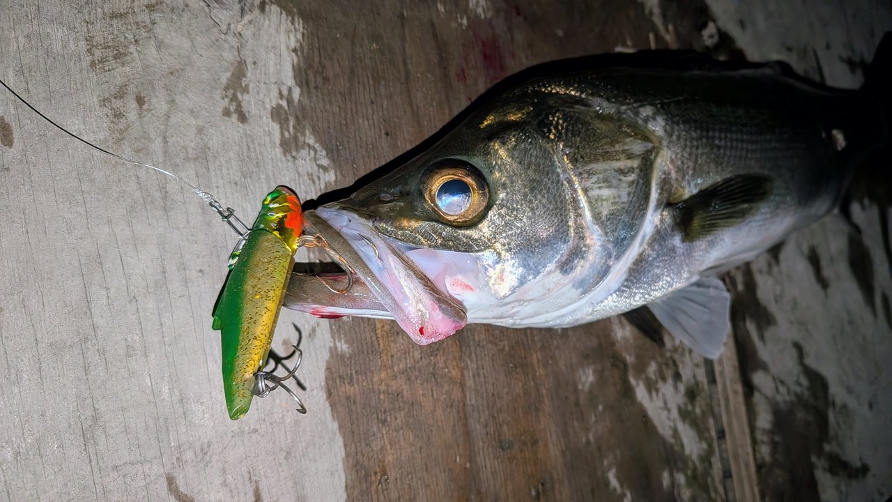 個人的に狙っていたタイミングの4月下旬新月大潮が到来したのでアジングへ行って来ました。既に数回釣行していましたが全てノーバイト。諦めずに通ってようやく釣果が出ました。金曜日夜で天候も潮周りも良い為混んでいると思いきやお目当てのポイントは意外と空いており準備を済ませエントリー。先行者の方に釣れているか伺うと「ノーバイトです」と(涙)とりあえず状況を知る為1gジグヘッドで探るも潮が無い。15分程探って移動。移動先は釣り人ゼロ。しかし実績充分のポイントなのでエントリーしキャストするとゆるーく流れアリ。レンジを刻んで角度を変えて飛距離を変えて探っていると強い流れが!1gで10カウントからドリフトさせていると「コン!」キタ――(゚∀゚)――!!今期初アジです。撮影を済ませキャストすると再び流れが緩くなっている・・・再び潮が効くまでキープキャストしていると再度チャンス到来。そして2匹目ゲット。そこからチャンスは訪れず、タイムアップ。今回得たヒントを元にまた行ってみます。