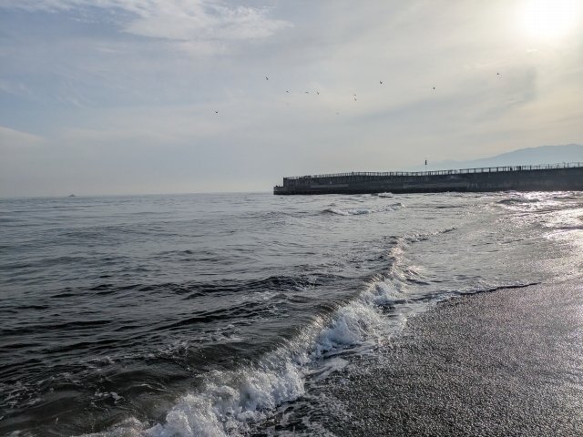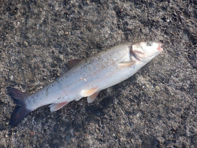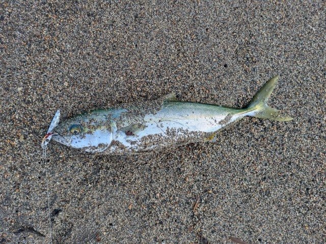 開始1時間くらいの所でHIT!なんかおかしな引き、これはエイかなと思った通り60cmオーバー多分2kg弱のアカエイ、ガッチリフッキングしており、潮が引いてきていたので岸の方まで戻ってのリリース。戻って30分程して上流側の2~3名が終了し帰っていきましたが知人曰く、まだチャンスは昼くらいまでありますとのことなので踏ん張りました。すると11時過ぎ頃から魚っ気が出てたので誰か釣るかななど思っていると知人Mが何やらHI!程なくランディングしたのは60cmは越えてるかなという