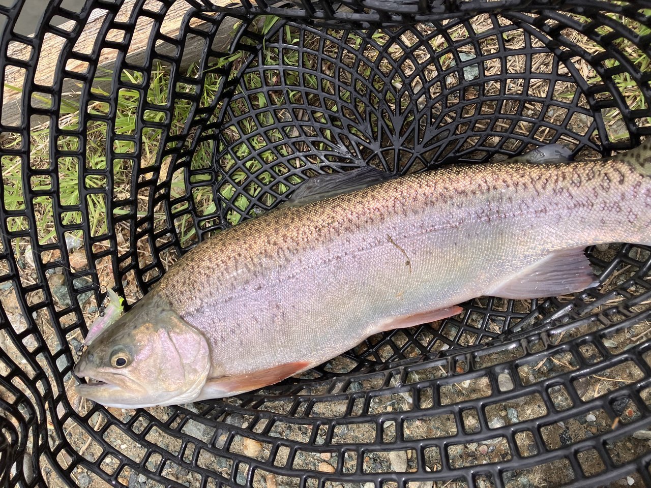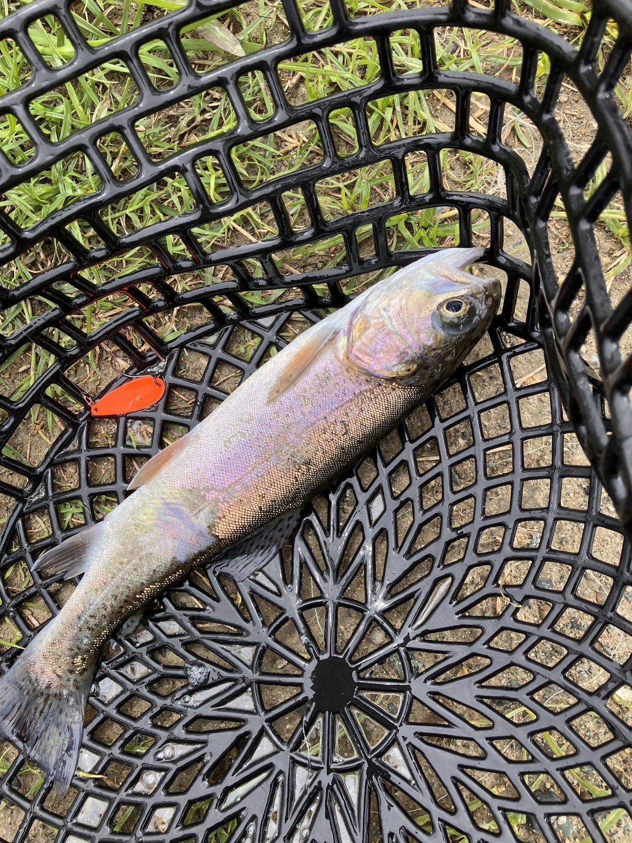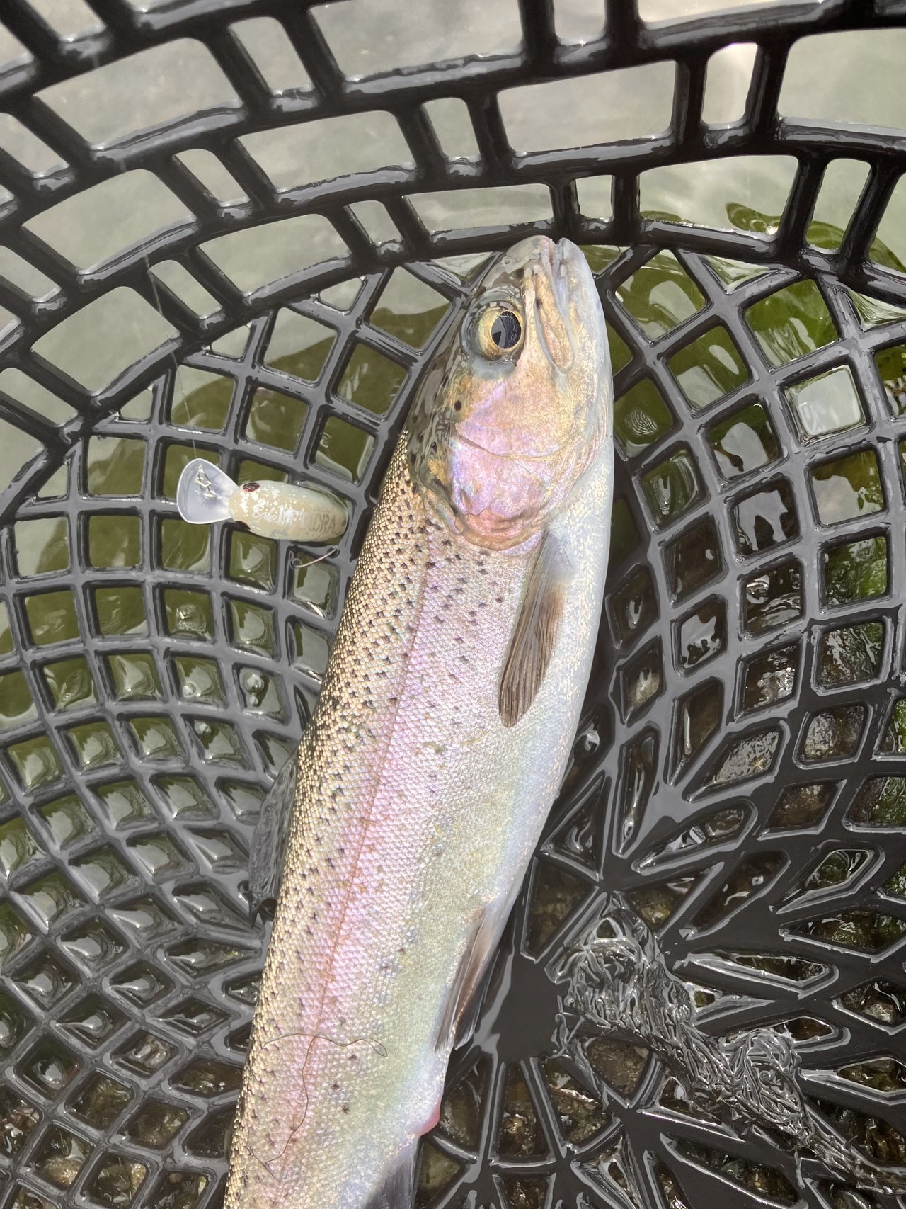 朝一、入渓間もなく1匹目のヤマメキャッチ。パーマークの綺麗なヤマメでした。水の状況は水色良くやや水量が少ないものの良い感じです。大渕に差し掛かったところで悲劇!50cmクラスのレインボーがヒット。魚体がはっきり確認でき尾びれの状態もピンピンと確認できる距離まで寄せ、後はランディングといったところで痛恨のバラシ・・・・ショックが抜けないまま次のポイントへ・・ここでも同じくレインボー。先の魚よりはやや小さいもののこちらもそこそこの大きさ・・がっ!またあと少しのところでフックアウト・・・・その後、22cmほどのヤマメを引き出しキャッチしましたが2匹のレインボーバラシが尾を引いてなんだかモヤモヤ。次にチャンスがあれば必ずキャッチを誓う事となりました。