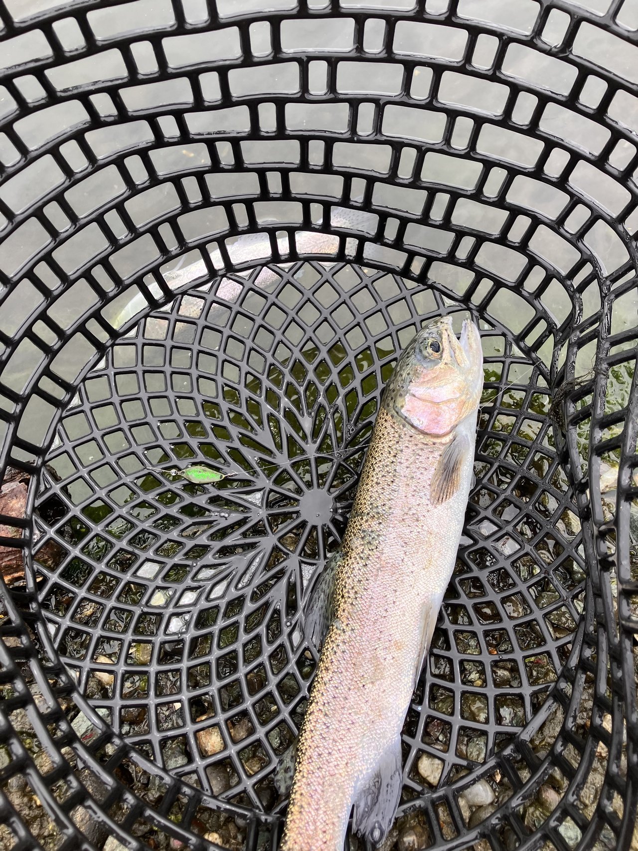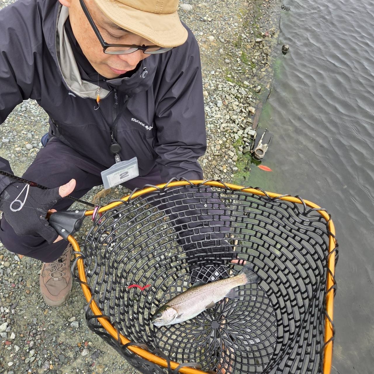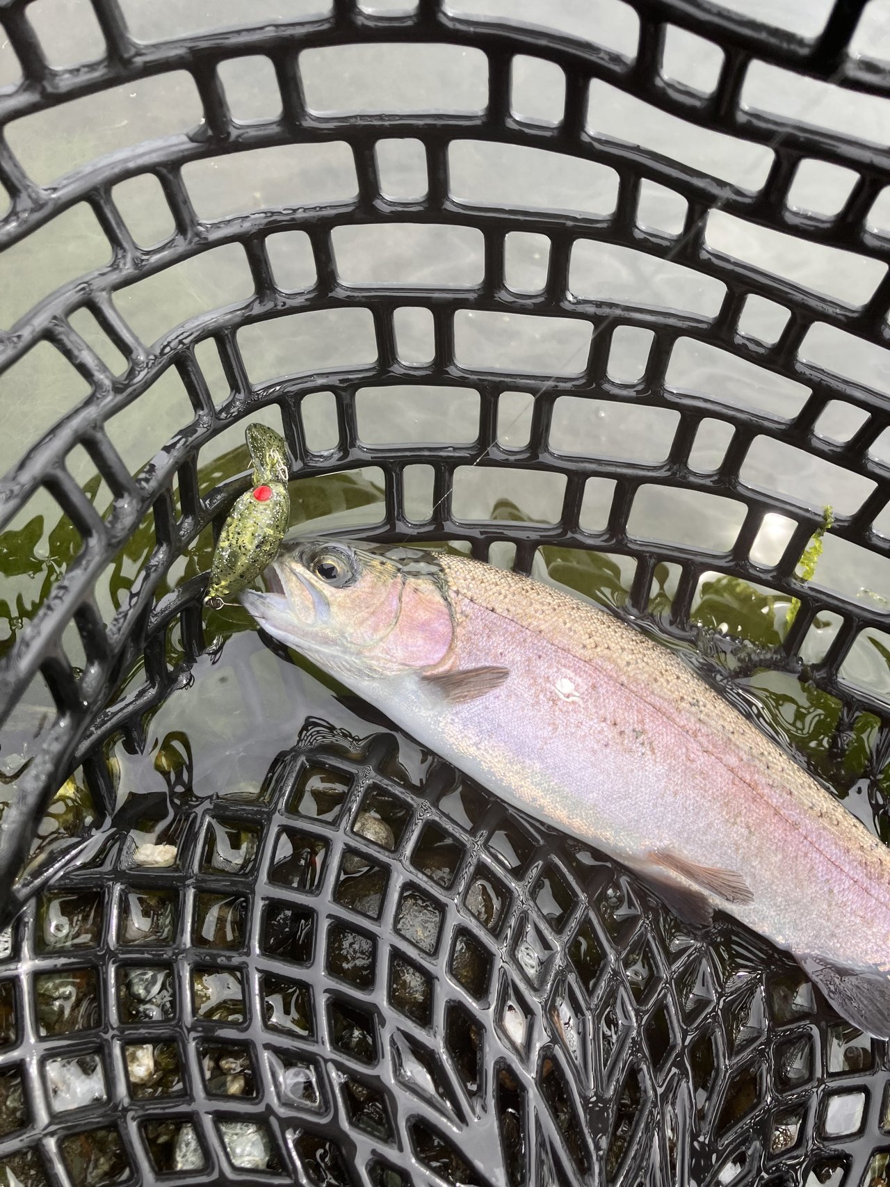 朝一、入渓間もなく1匹目のヤマメキャッチ。パーマークの綺麗なヤマメでした。水の状況は水色良くやや水量が少ないものの良い感じです。大渕に差し掛かったところで悲劇!50cmクラスのレインボーがヒット。魚体がはっきり確認でき尾びれの状態もピンピンと確認できる距離まで寄せ、後はランディングといったところで痛恨のバラシ・・・・ショックが抜けないまま次のポイントへ・・ここでも同じくレインボー。先の魚よりはやや小さいもののこちらもそこそこの大きさ・・がっ!またあと少しのところでフックアウト・・・・その後、22cmほどのヤマメを引き出しキャッチしましたが2匹のレインボーバラシが尾を引いてなんだかモヤモヤ。次にチャンスがあれば必ずキャッチを誓う事となりました。