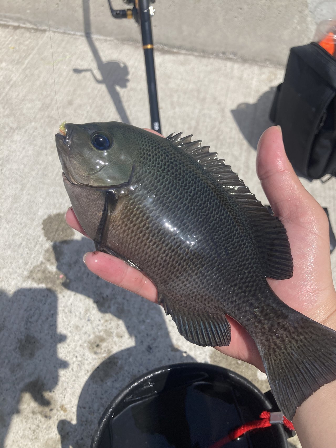 岸際を引いているとポシュっ♪♪予想していなかったサイズの子がガッツリ喰ってくれました!!ww