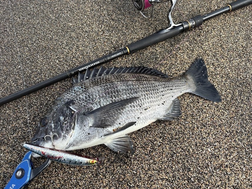 波を待ち、サラシが広がるタイミングでミノーをキャストし、サラシの中で2~3秒ステイさせた瞬間に待望のバイトが!しかし上がってきたのはヒラスズキではなくクロダイ君でした(^-^;