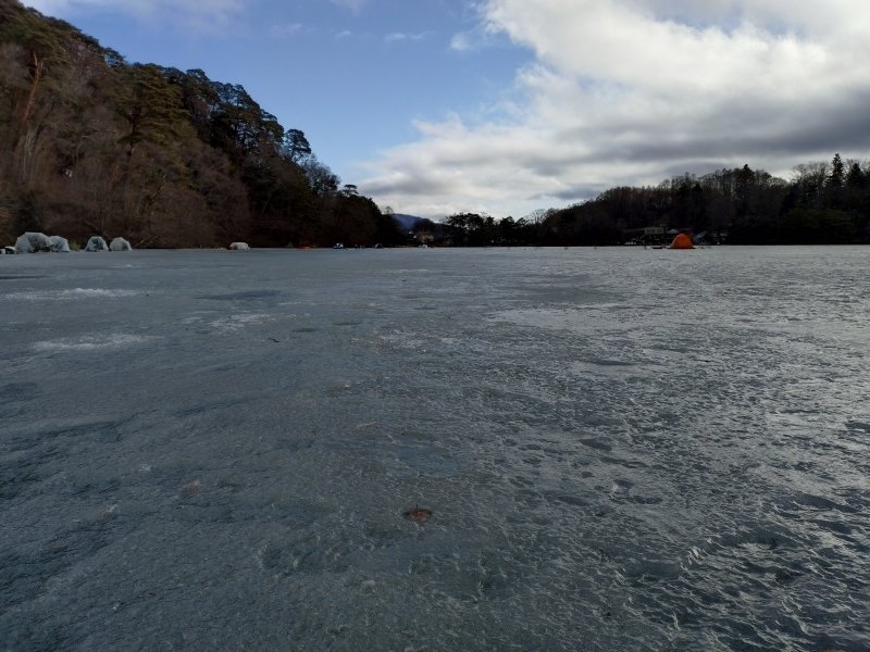 今期2回目の松原湖。湖面に雪は乗っておらずツルツル真氷でアイゼンが必須。今回は朝一数狙いでポイントを設定、何カ所か穴をあけると宙層にワラワラとワカサギの反応が有り、その場所にスタッフ江村&福島からはるばるやってきたスタッフと3人で入る事に。ばらけて浮き気味の当歳魚を1.2m仕掛で棚広く釣るが、大きいのが混じらず面白みに欠けるので9時過ぎに場所移動。松原湖の中ではデカサギ狙いのポイントへ♪昼食をはさんで16時までポツポツ掛かって132匹と楽しめました。