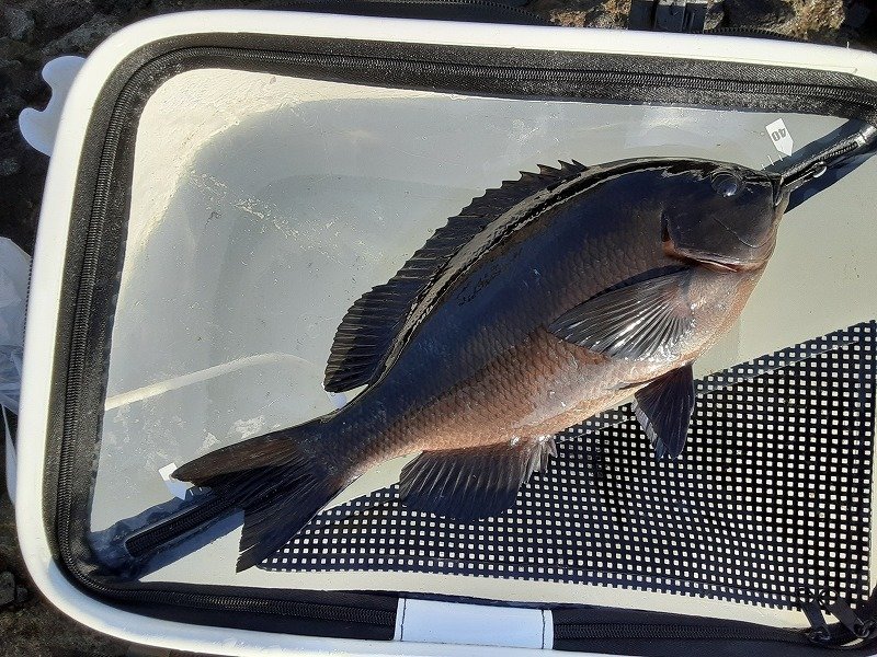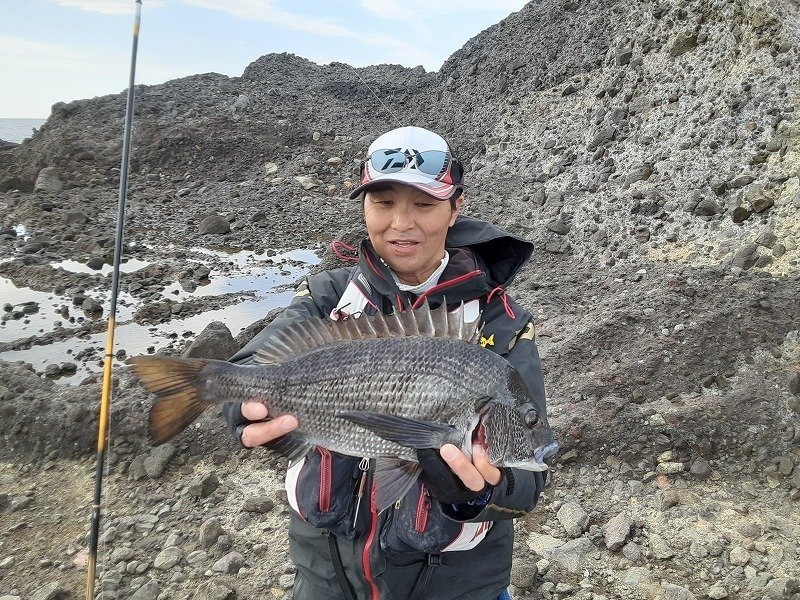 磯釣り釣行2日目は下田、田牛沖磯へ。今期最強寒波襲来の1日目、爆風の西風15mのなか何とか安全な地方の沖磯へ無事渡礁、前半戦はこの風との戦いでした・・・風がおさまってきたお昼前からポツポツ本命メジナからのアタリをもらえ水中ウキとの2段仕掛けで良型3匹キャッチ、潮が流れ出す瞬間に鯛系特有の首振りファイトをいなして良型のクロダイもキャッチ。(場所がらマダイにもちょっぴり期待が・・・)潮が流れ出してからの上がり間際に潮筋を流している仕掛けに竿引きの強いアタリで釣れたのが当日最大39cmの良型メジナでした。午前中は強風でどうなるかと思いましたが何とかお土産キャッチできました。両日共に低水温でアタリは非常に渋く、少ないアタリをいかにかけ合わせられるかがカギとなります。寄せ餌との同調、ウキの感度と小針はマストです。