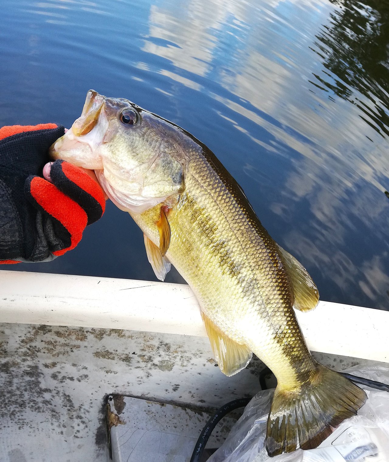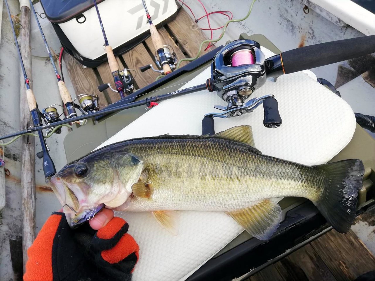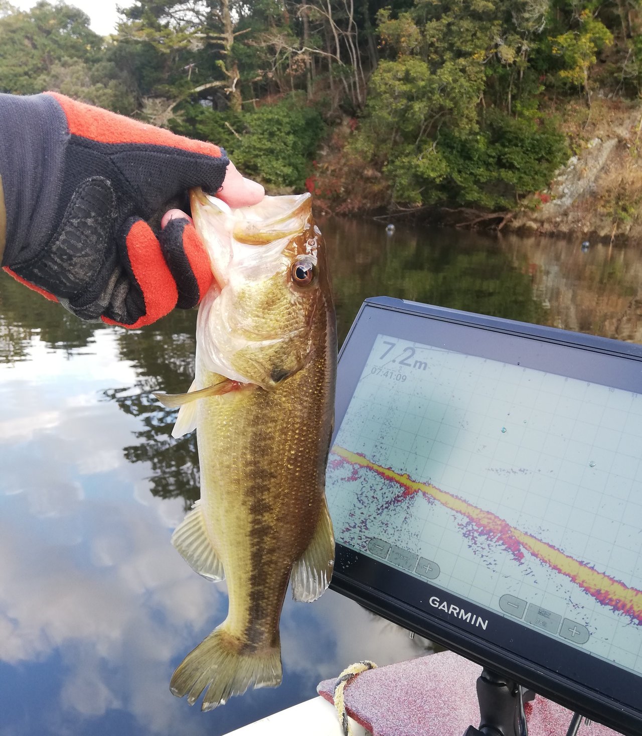 関東で一番遅い紅葉が終わり湖岸の山はすっかりと冬枯れの様相、人出も少なく静寂になった房総リザーバー三島湖釣行。晴天無風の湖面は鏡だが水温は10℃を下回ってきた。こうなるとサイズ不問なら水深7m以深のディープ攻略が必須。開始即、桟橋の目の前の水深7~10mにFFS魚探で反応を探すとボトムぴったりに張り付いた魚影の他に稚ギルらしき魚影も映る。早速、冬の定番攻略のダウンショットを投下すると幸先良く2投目で25㎝級がヒット。この後も10m前後のボトム狙いに魚影を見つけては5g鉄板やダウンショットを投下すると比較的に素直に口を使ってくれてポツリポツリと数を重ねる。ただ良型(自分の中では40㎝オーバー)らしき魚影も有るがチェイスまではあるがバイトまでが容易ではない。昼頃に6~7m位のショアのストラクチャー際に反応はあるがフッキングまでには至らない。朝方に良かった10m前後のポイントに戻り拾い釣りが出来た。ネット際のバラシやショートバイトも少なくはなかったのでバイト数自体は水温の安定と昨年よりは水色、水位が良い為か活性は悪くない様子。今後もまとまった降雨が無ければ冬のバス釣りを楽しめるはず。