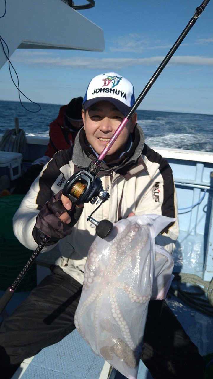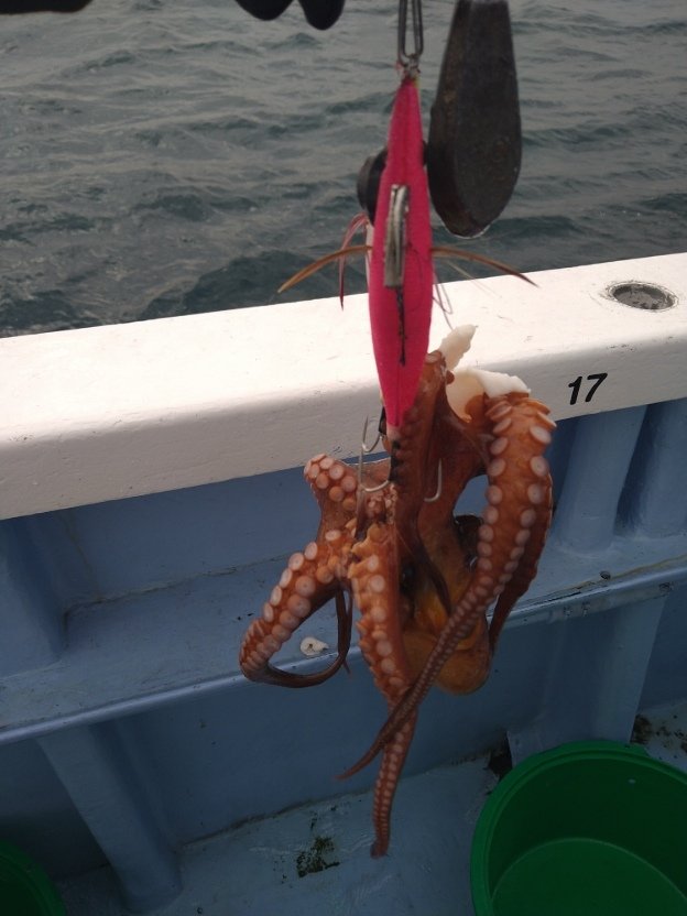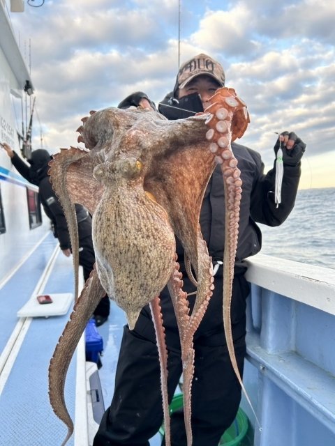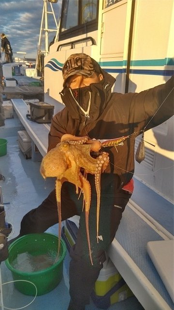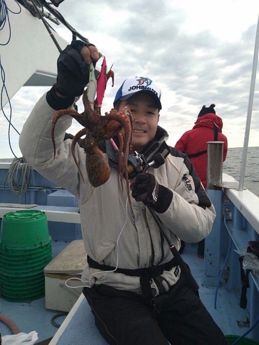 今回は上州屋スタッフ6人での釣行AM4時に受付を済ませ5時出船、航程約60分程でポイント到着し船長の合図でオモリ60号から釣りスタ-ト、仕掛投入後船下にラインが入って行く潮が程よく効いている感じ、そく回収して80号にチェンジして再度投入し入替探っていくがアタリが無い・・ここでポイント移動し再度釣り開始、今度は潮下になり仕掛けが払い出されて行く根掛かりに注意しつつ探っていると”ジワリ”重くなるアタリ!回収すると0.5kクラスのチビタコでした、チビでしたが朝一のアタリをゲット出来たので気分が良い、続けているとここから連チャン乗りスタ-ト!!1.5Kg・2Kgクラスを立て続けに捕獲、そして初の4Kgオ―バ―を捕獲に成功両腕パンパンになりましたがデカタコとのやり取り最高に楽しかったです。その後は潮が効かなくなりチビタコ数匹追加して終了沖上がりとなりました。