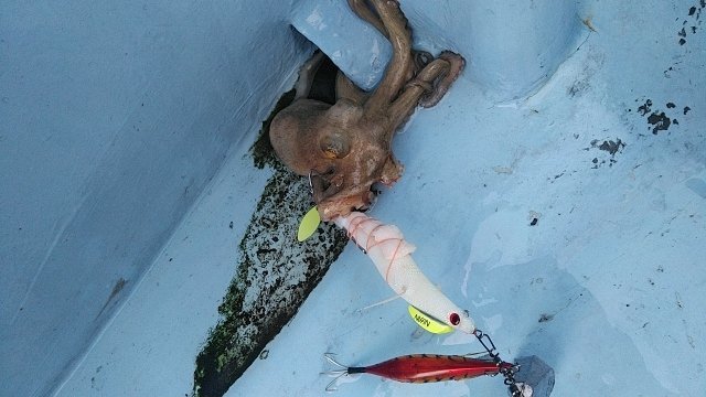 船中ポツポツタコが上がっておりますが、自分は苦戦しなかなか釣れない…。皆2〜3杯釣れてる中ようやく小型ながらお土産ゲット!このまま終了かと思いましたが、終盤に根掛かり?タオルで糸を引っ張ると動いた・・・タコだ!ずっしり2キロ位のタコをゲットし終了。最後に港でキャベツを2個貰いたこ焼きをやれってことか?笑
