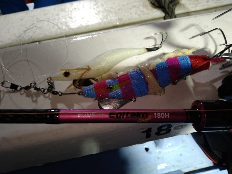 今回乗りの良かったタコエギは、シマノFブースト(アカキン)NISSINタコエギデカver(グロ-ベースの白)グローオレンジが特に良かったです。またラトル入りとラトル無しもMIXして使うと良い感じでした。豚の脂身や鳥皮はお好みで使うと良いですね。