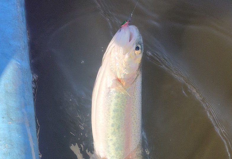 では本題に、前もって予約が取れたので、足柄CAにいってきました//朝から元気のいいマス達が・・・と言いたいとこでしたが、現地の気温は氷点下で魚達の反応が悪く厳しい状況。ガイドも凍ってルアーが飛ばない。。エステルラインは硬く、大型魚とのやり取り中にラインブレイクなどトラブルも多く・・・(´;ω;`)10時近くまでは日が当たらず苦戦しましたが、気温上昇と共に活性が上がり、更にトラック放流もありポツポツと釣れました!!今回は大型マスゲットできず・・・。。。。