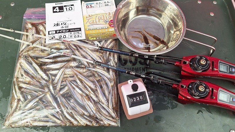 ■ルアー・仕掛け:オモリ)9g 仕掛け)袖1.5号5本針+下針 エサ)炎魔・紅チーズサシ