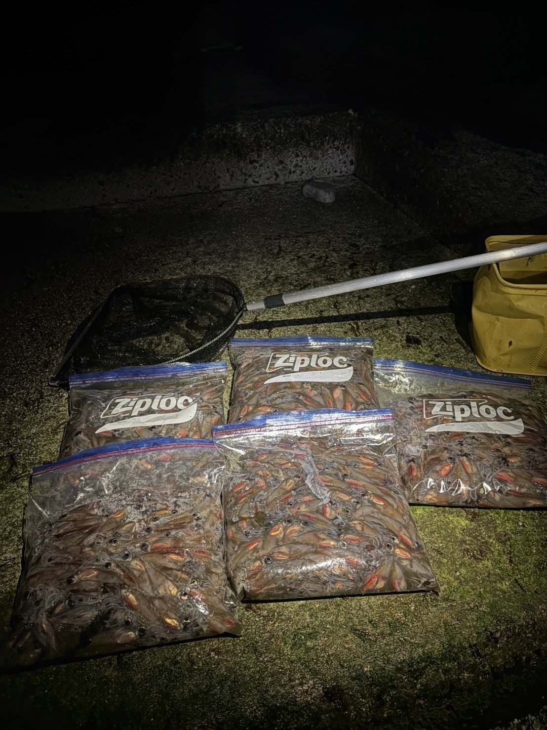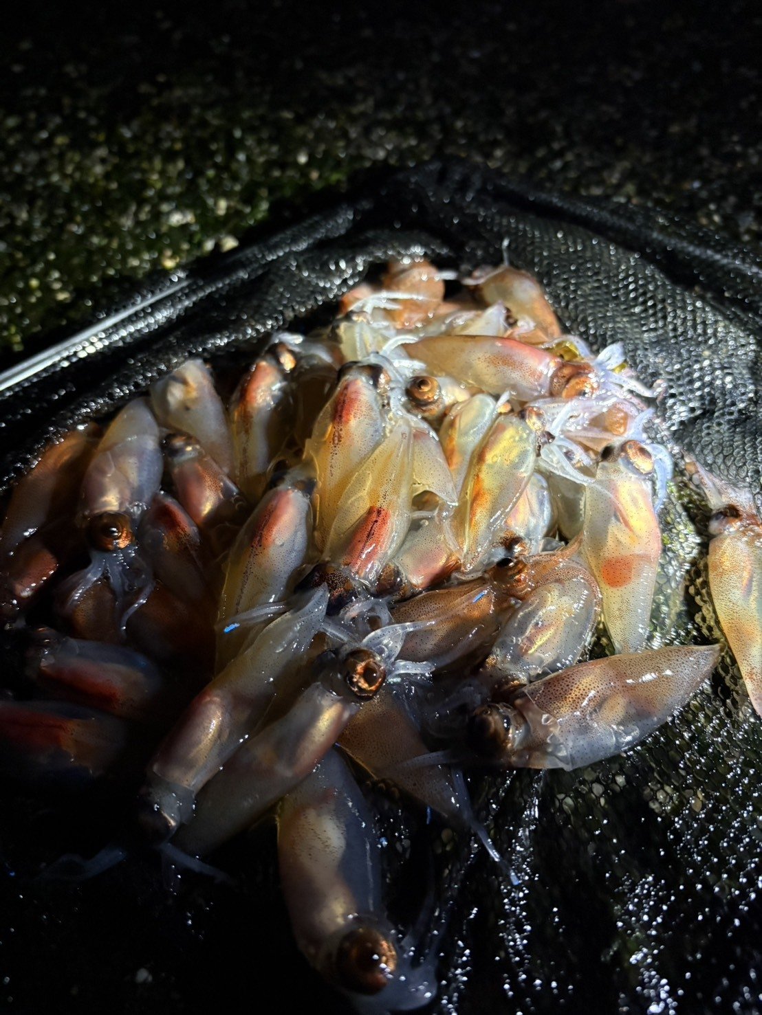 富山県は東部。まずは宮崎海岸にてスタート。しかしながら波が高く南下しながら波が穏やかでホタルイカの良そうなポイントを探していくとほど良い場所を発見!開始早々に1時間1キロペースで掬える状況。その後もどんどん湧きが増していき午前5時前にはあまりに取れるので10kgほどとって終了!最後の10分で2~3kgとれる状態だったそうですよ♪