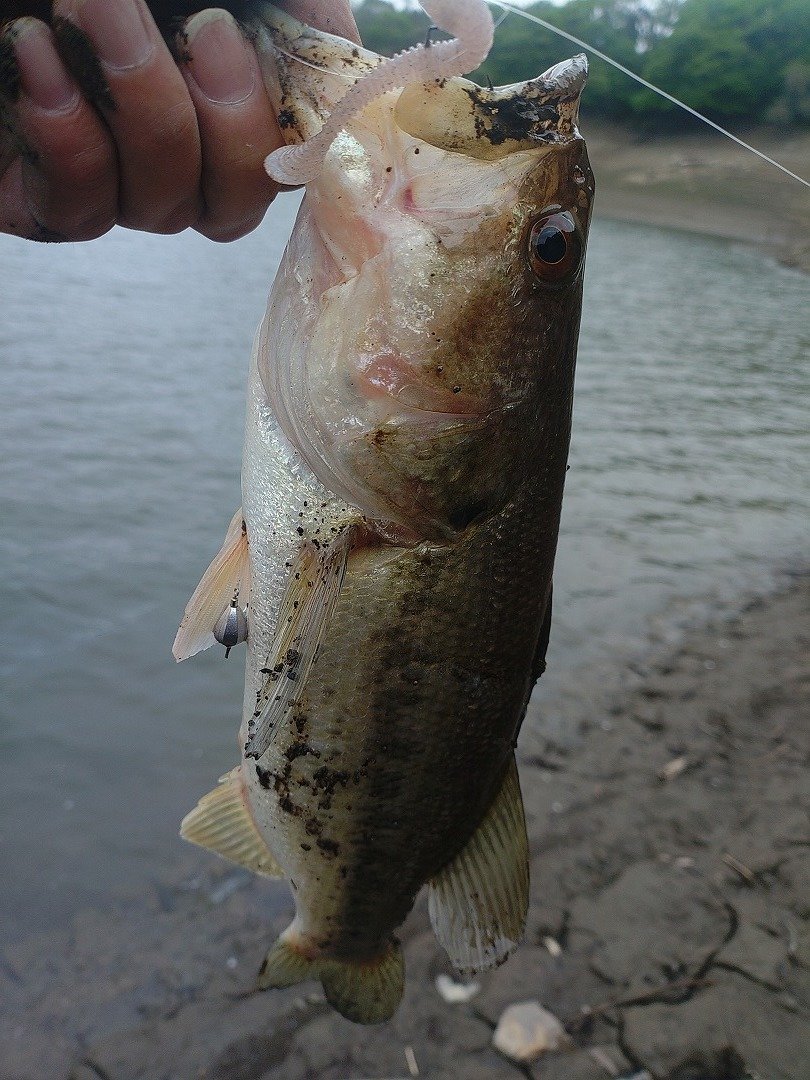 今年初の津久井湖陸っぱりバス。大減水中の津久井湖で釣れるのか心配でしたが、2時間20分でアタリ4回で2本ゲットとまずまず楽しめました。湖岸は滑りやすくなっていますので、長靴・自動膨張ライフジャケット必携で楽しみましょう。