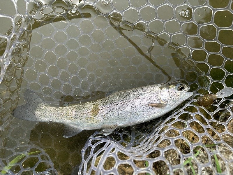 スタッフ高橋で~す!お客様といなべのサンクチュアリさんへ!うわさの冨士の介が釣りたいお客様・・ですが、少し出遅れて到着した為、第1ポンドは満員御礼。なので第2ポンドで二人並んで釣り開始。最初はパターンが掴めず苦戦しましたが、表層に浮いている魚を軽い目のスプーンで攻略する事に成功!順調に数を伸ばせました。が、お客様は苦戦中・・重いスプーンでグリグリ巻いて釣れる魚がいない?軽い目のスプーンに変えて何とかポツポツと・・