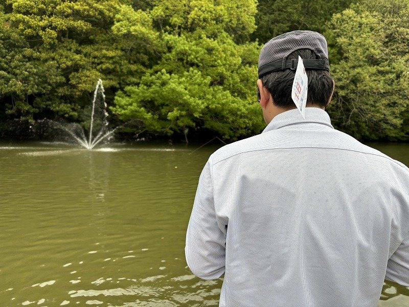 午後からは風が強くなり、我々の釣り座は向かい風・・軽いスプーンでは飛びません・・が、魚は足元に固まっていますので問題無し!ただしライントラブルが多発します。我慢の展開ですが、釣れるから楽しめました。お客様はラスト1時間、待望の第1ポンドで冨士の介を狙いに・・桟橋の空きスペースでチャレンジ!・・釣れないみたいいです・・・・やがてペレットタイム!エサ撒きにより水面は大賑わい!しかし意外と釣るにはコツがいる・・で、何とか釣り方を合わせてヒットに持ち込まれました!