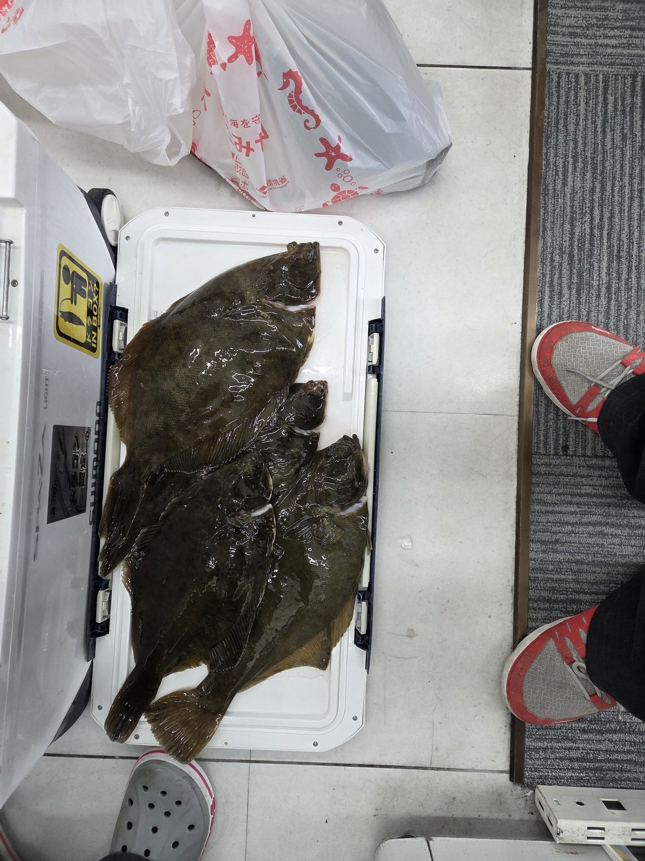 【横須賀うみかぜ公園】横岸壁最新釣果情報です。カレイハンターの上田さまよりまたまた釣果のご報告を頂きました♪朝に25㎝、お昼前に35㎝と順調に釣果を重ねお土産十分で早上がりとなりました♪最近はマダイを狙っていたそうですがこちらは不発・・「やっぱり俺はカレイなんだな(笑)」と納得のご様子でした^^。カレイも簡単に釣れる魚ではありませんがサクッと釣って来るのがカレイハンターですね。上田様、大漁おめでとうございました。釣果のお持込みも有難うございます♪さて、横須賀海域のカレイ釣りは6月頃まで続きます。最近ではちょい投げのシロギスの釣果も上昇中ですのでゴールデンウィークにも是非狙ってみてください。当店では新鮮なイソメ類をご用意しております。平日は7時から土日祝日は3時からの早朝営業も行って居りますので横須賀・三浦地区へお越しの際は是非当店にお立ち寄り下さいませ。
