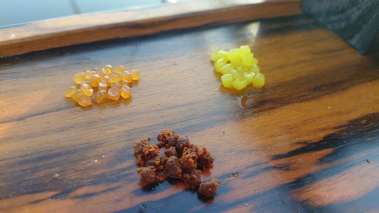 ■釣り方:1〜3本の力玉のセット釣り ■竿:シマノ 朱紋峰 本式 14尺 ■浮子:巧実 バトルシリーズ 浅ダナセット M→S(3→2目沈め) ■道糸:東レ 将鱗へら スーパープロ 道糸 フロロ ゴールド 0.8号 ■ハリス:㊤:ダン へらハリス 0.4号/10→8CM ㊦:ダン へらハリス 0.3号/45→50→55→60→40CM ■ハリ:㊤:ハヤブサ 鬼掛け 極ヤラズ 鋒 5号 ㊦:ハヤブサ 鬼掛け 喰わせヒネリ 1号 ■エサ:《バラケ》マルキユー ①:粒戦100+瀑麩25+水175 吸水後ふぶき 250 ②:粒戦100+瀑麩50+水150 吸水後ふぶき 200 粉の状態で良く混ぜ合わせ、水を入れたらしっかり吸水するまで数分放置。 その後、吸水し固まったら《ふぶき》を入れ熊手で良く混ぜ合わせる。 一握り半ぐらいを別ボウルに小分けする。 エアー抜き/エサ付け/チモトの付け圧具合等でナジミ幅/バラケ具合をコントロールする。 基本は手水と基エサで調整する。 クワセ マルキユー 力玉 改/さなぎ玉/クロレラ黒玉。 ■飯:※帰飯は野暮用がある為控えさせて頂きました。