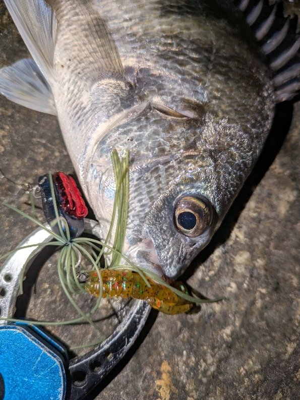 今回は表層付近では反応が無く、中層からボトム付近で反応がありHITワームはMy定番のエコギアの熟成アクアアジコムシとDUOのバーニーでした