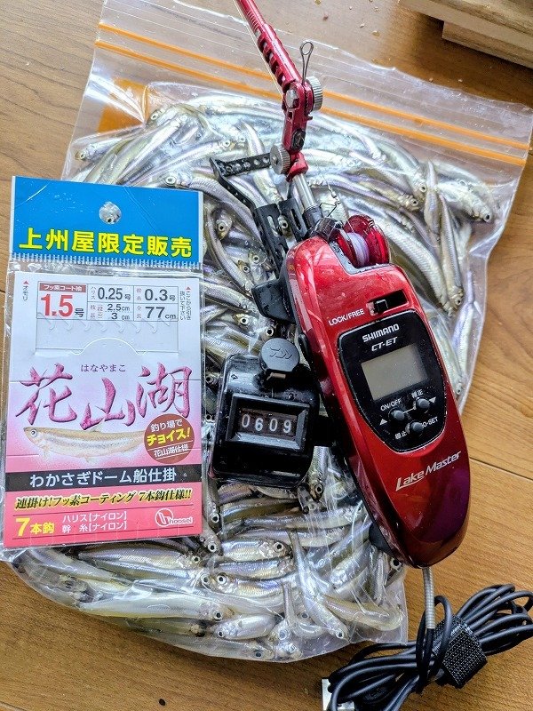 ■ルアー・仕掛け:オモリ)9g 仕掛け)袖1.5号7本針+下針 エサ)紅チーズサシ(寄せでブドウ虫)