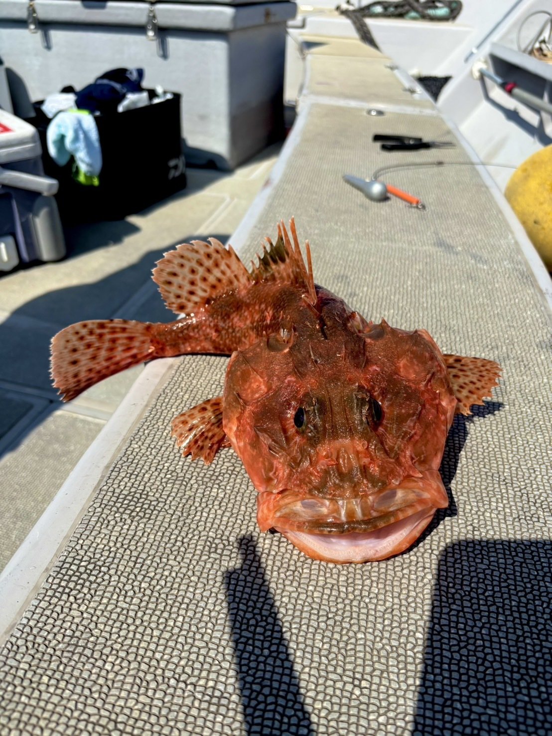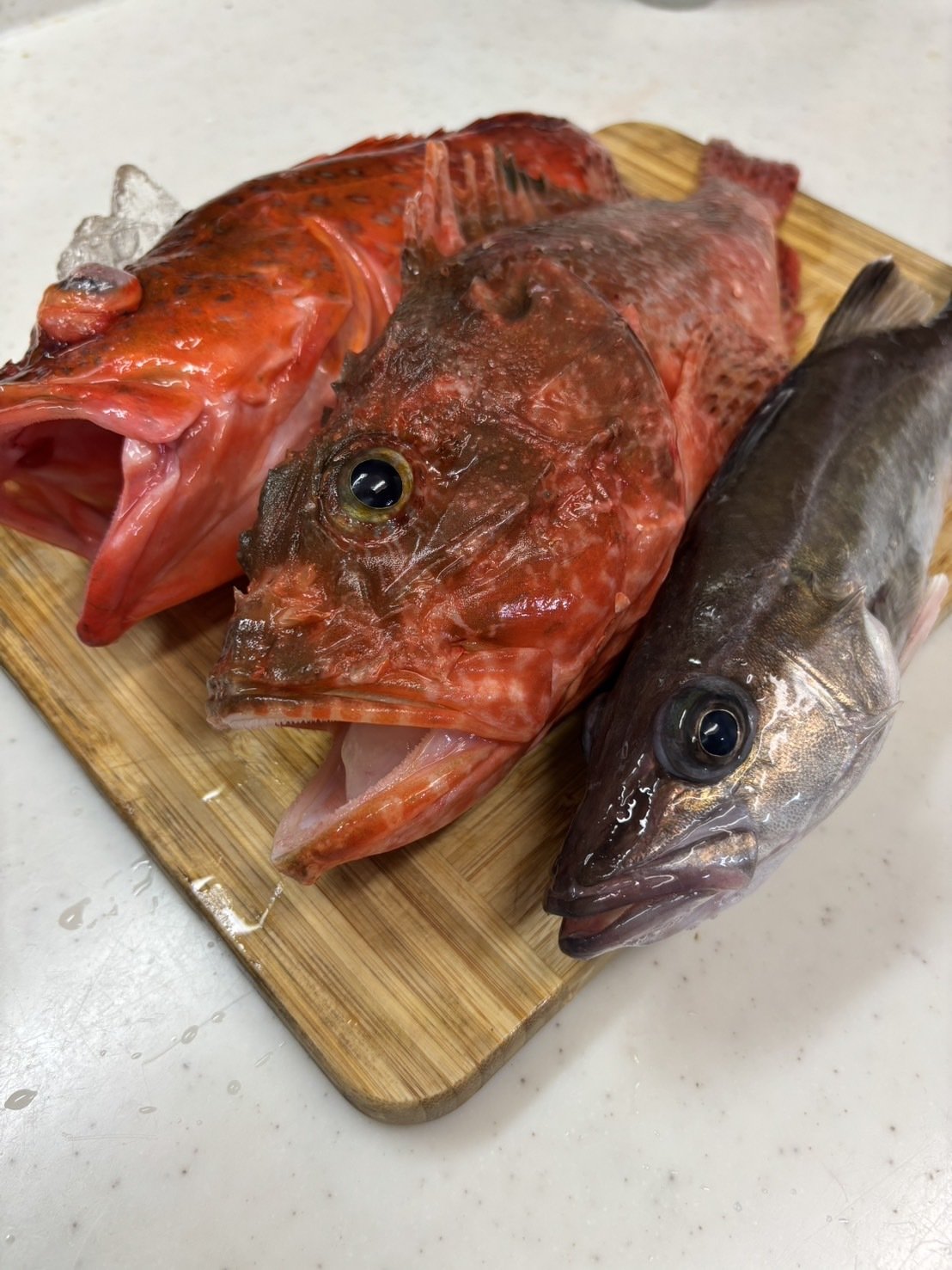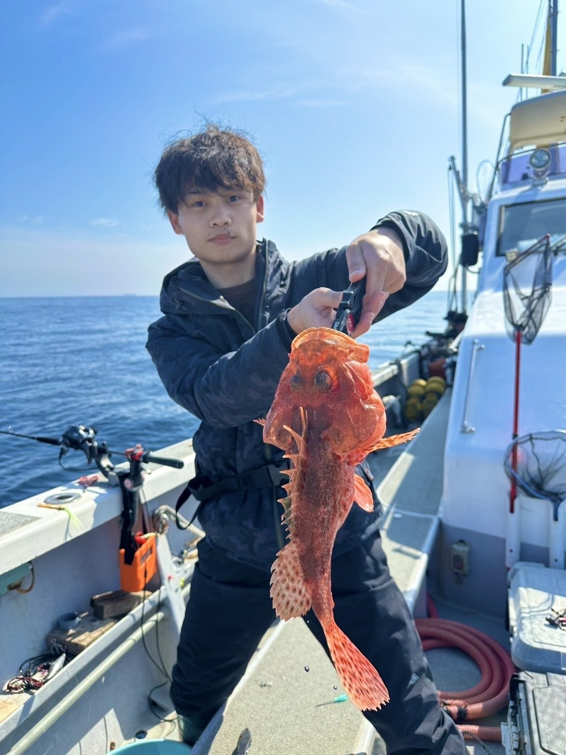 スタッフ明田です。元アシスタントの内田君よりオニカサゴの釣果を頂きました! 間口漁港、一郎丸さんより出船! 水深は180mで付けエサはサバの切り身&ホタルイカので本命のオニカサゴをキャッチ! お鍋に入れたらとても美味しかったそうです♪ 他にもアラなどの外道も混じりました!
