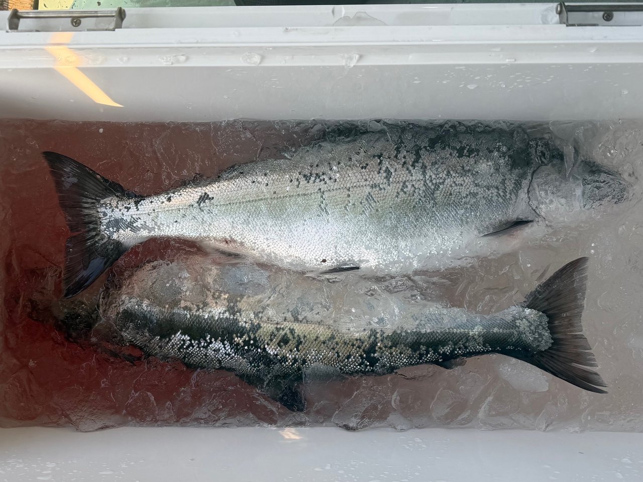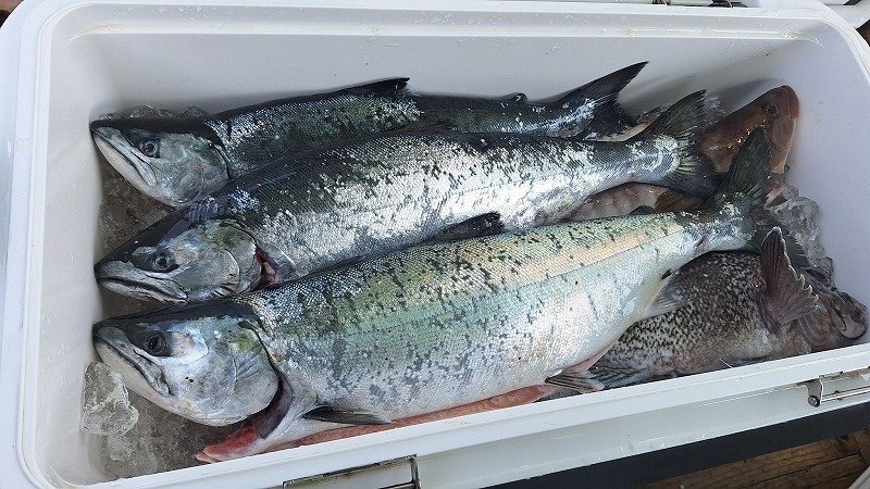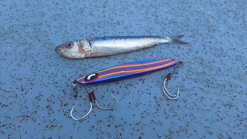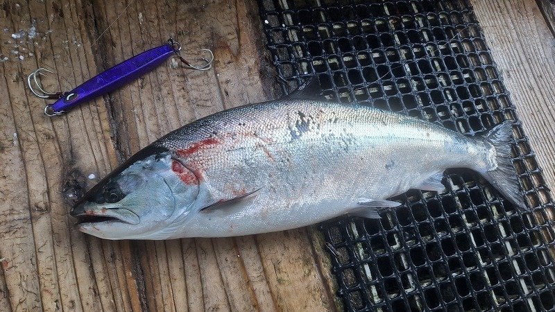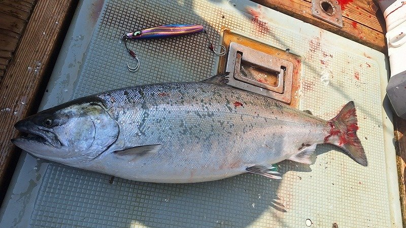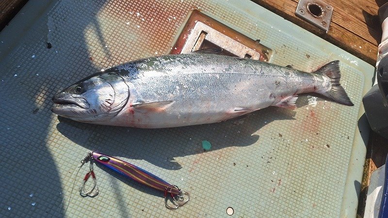 今回は尻屋崎沖のポイントです、前日潮が早かったとの事だったのでロッドを#3にしてSPY-N150でスタート、早い時間にこれで1本目をキャッチ。ブルピンのジグが釣れているとの事なのでSPY-V180gのブルピンのカラーに交換してその後2本目をキャッチします、朝のうちに2本釣れますがその後はアタリが出せない、アタってもバラシが1回掛け損ないが2回とキャッチできずに2本で終了でした。尻屋崎沖がポイントとなり魚のサイズが良くなり、航程も1時間位となり下北のマスジギングいよいよ本格シーズン到来です!