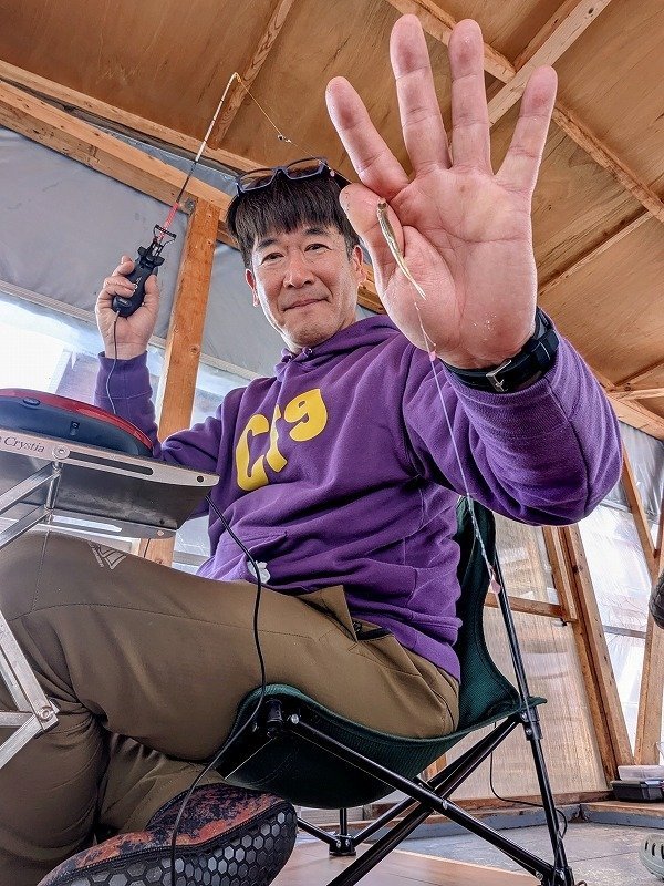 そう信じてあの手この手の誘いをすればワカサギ達は素直に答えてくれます。それと、前日の風でドームが動くわずらわしさも軽減して微妙なサワリが読み取れる事で釣果も伸びてくれました!