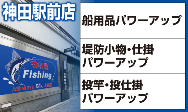 10月末の上州屋渋谷店閉店後、上州屋神田駅前店は渋谷店の船用品、堤防小物・仕掛、投竿・投仕掛etcを順次引き継ぎまして更にパワーアップする予定です!どうぞご期待下さい!