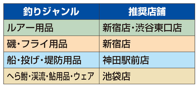 また、渋谷店閉店後も引き続き安心して釣具お買い物を楽しんで頂けますよう、ここに各ジャンル推奨店舗のご案内をさせて頂きます。10月末の閉店後、渋谷店各ジャンルの豊富な商品および取り扱いは、主に下記の都内店舗に順次引き継がれます