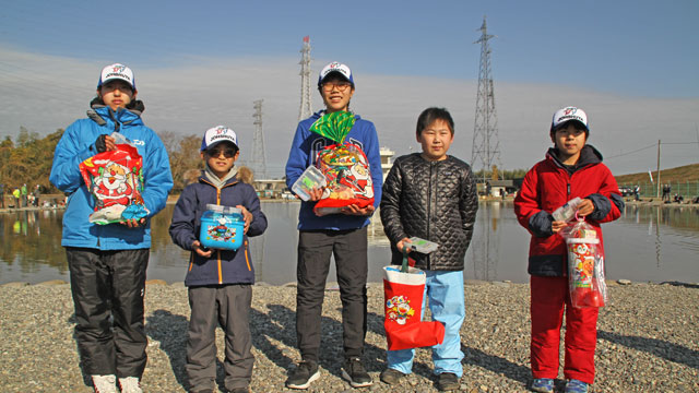 そしてこのタイミングで午前9時45分よりジュニアによる早掛け大会を開催!放流直後でしたが魚の活性が低く、バラシはあったもののキャッチまで至らず時間になり終了となりました。用意した賞品はジャンケンによる争奪になりましたが、楽しいひと時を過ごしてもらいました。
