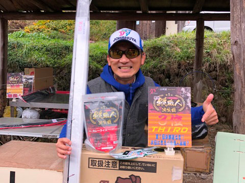 表彰式の後はお楽しみのじゃんけん大会!協賛メーカーからの多数の協賛品や、足柄キャスティングエリアからも特別割引き券の進呈が!参加者の皆様全員に何かしらの賞品を進呈することができました!また、なんと大会参加者様からも大会ロゴ入り缶バッチや矢切ネギなどの大変嬉しい差し入れまで!様々なプレゼントにより大盛況となりました!